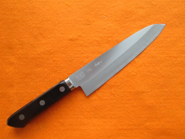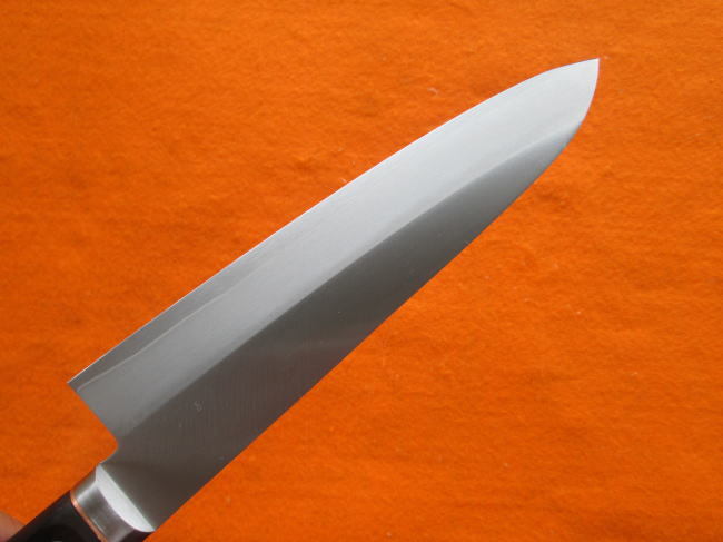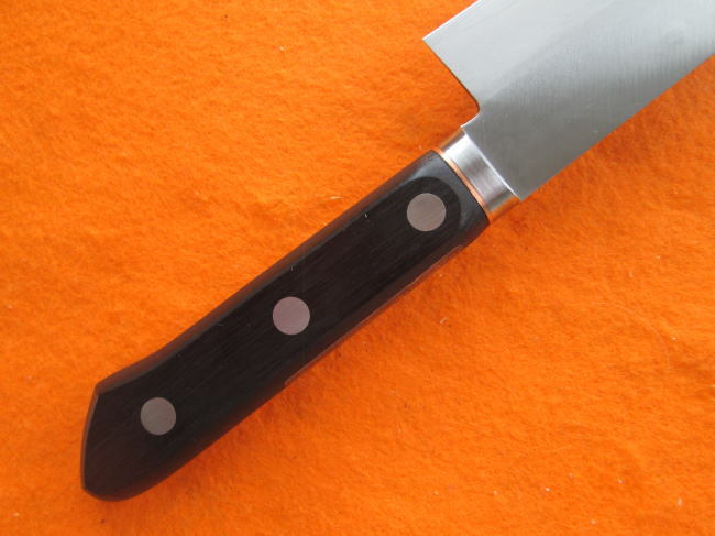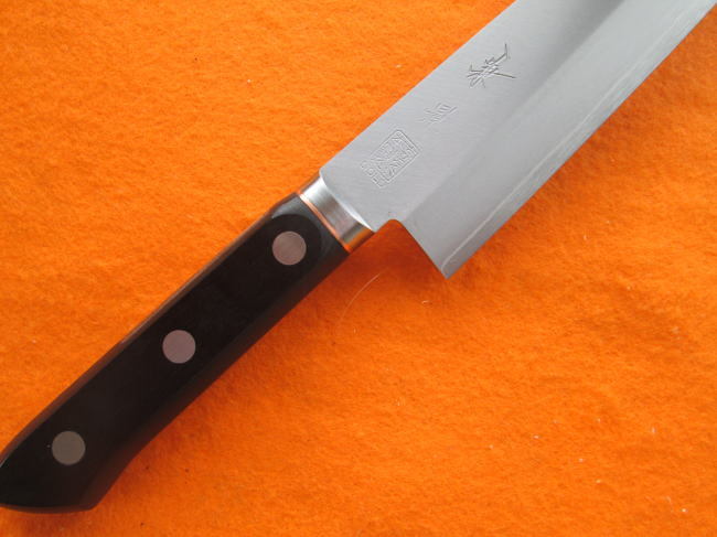 ステンレスとステンレスの間に錆に強い武生特殊鋼材のV金1号鋼を挟み込んだ三層構造の牛刀型万能包丁です。