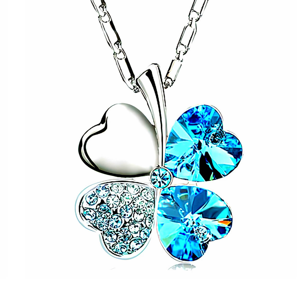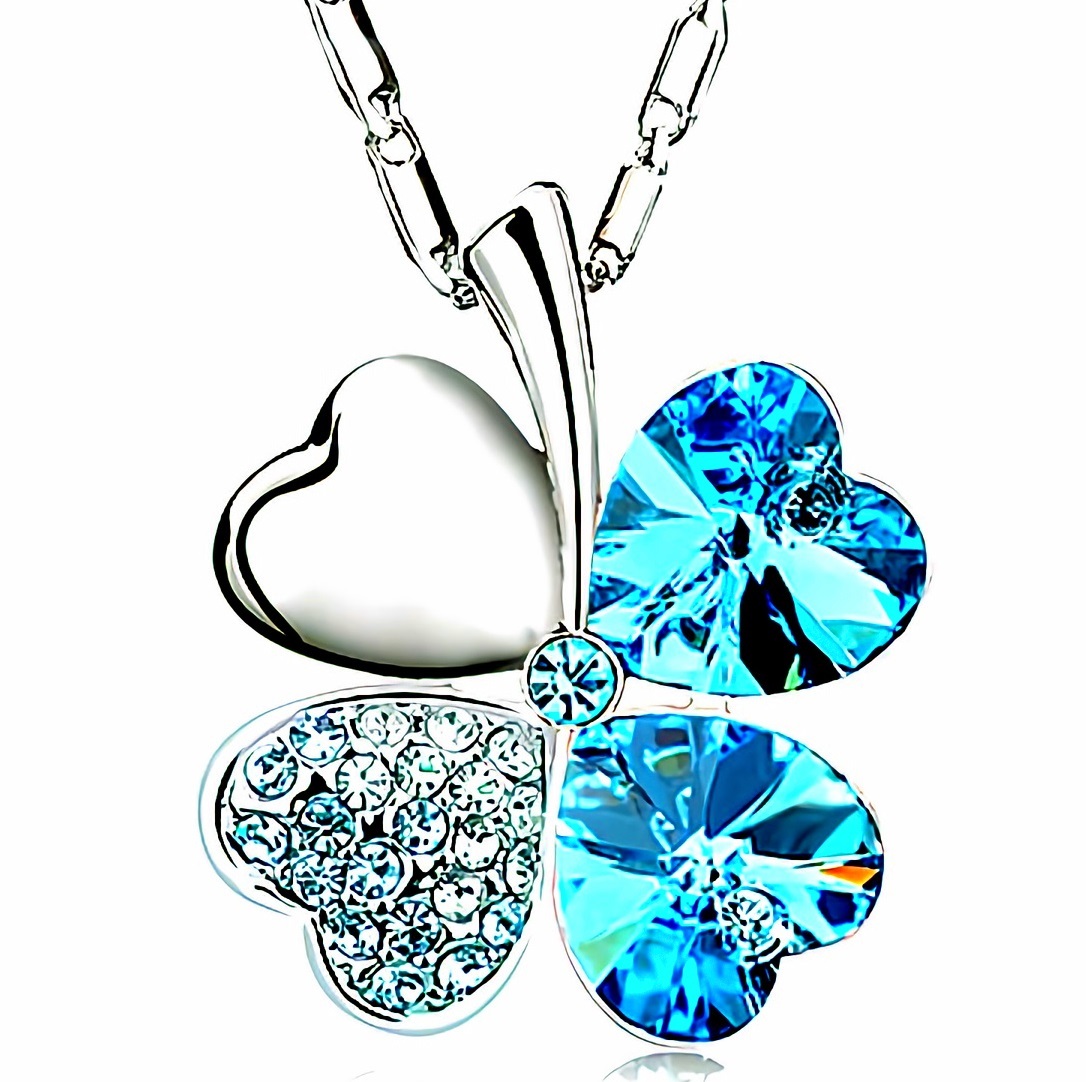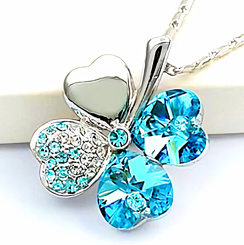水色に輝く四葉の葉が美しく、キラキラ輝くペンダントトップは胸元で存在感ある輝きを放ちます。