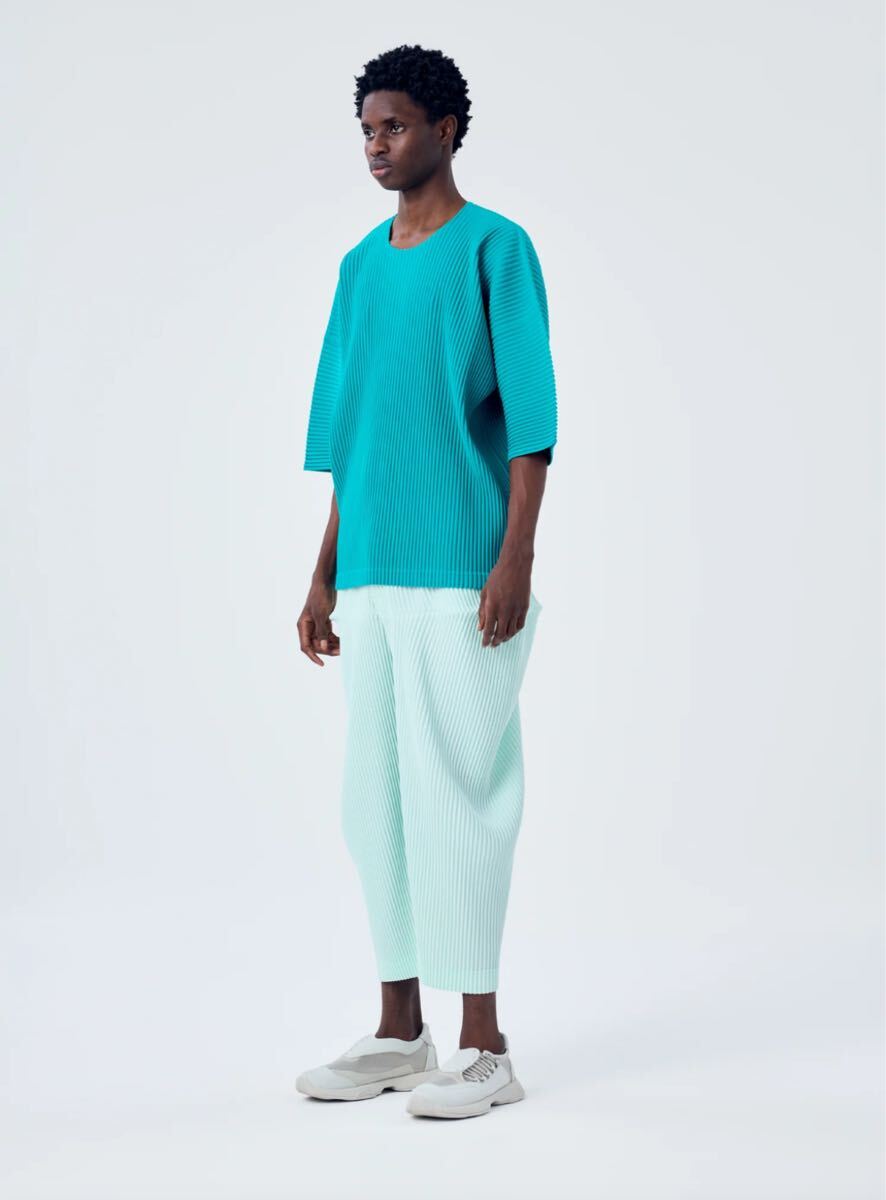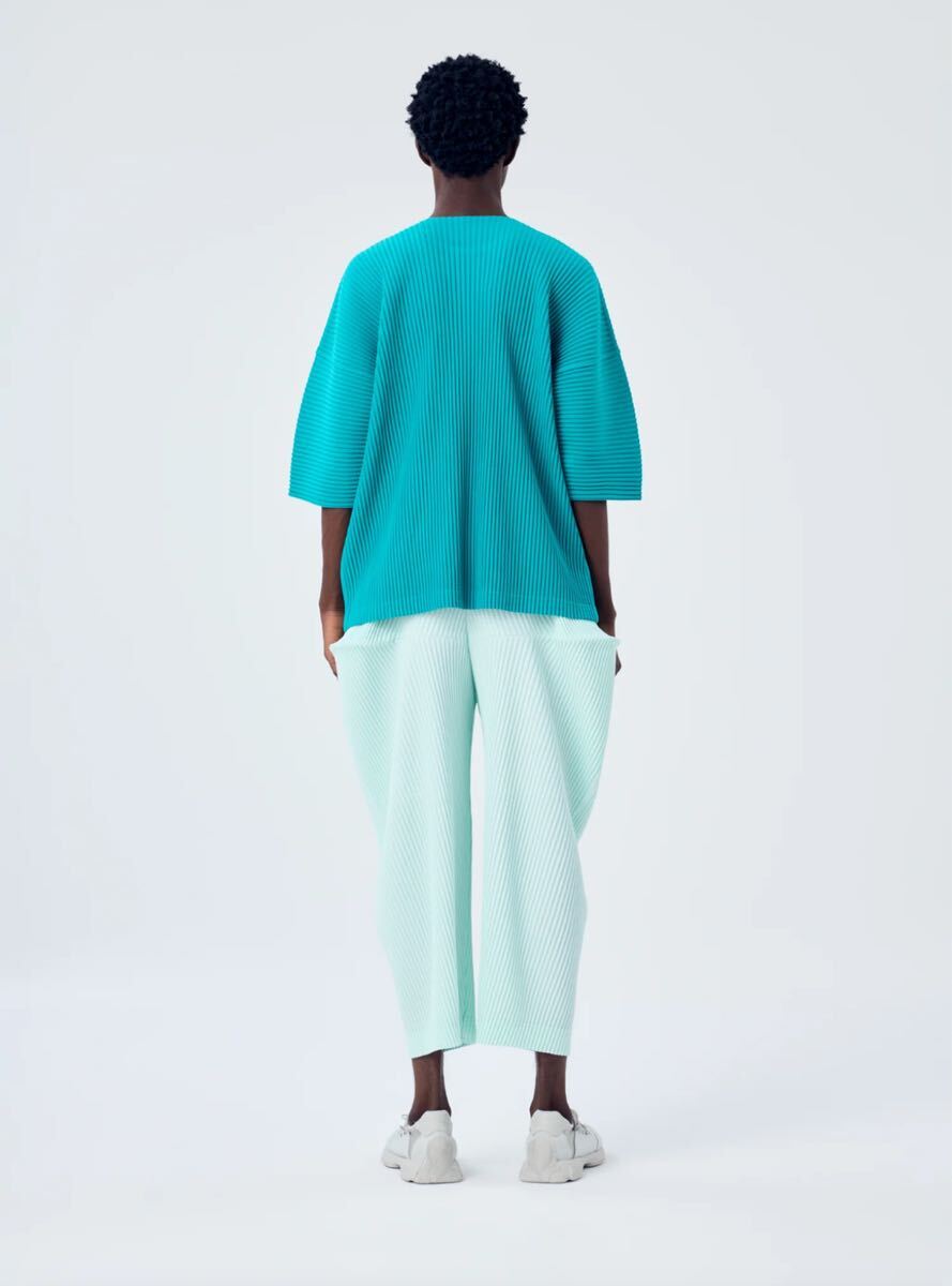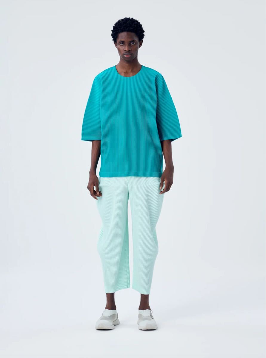 爽やかな色調の丸首半袖トップ。ポリエステル素材特有の乾きやすさを備え、携帯性や軽やかな着心地が特徴です。