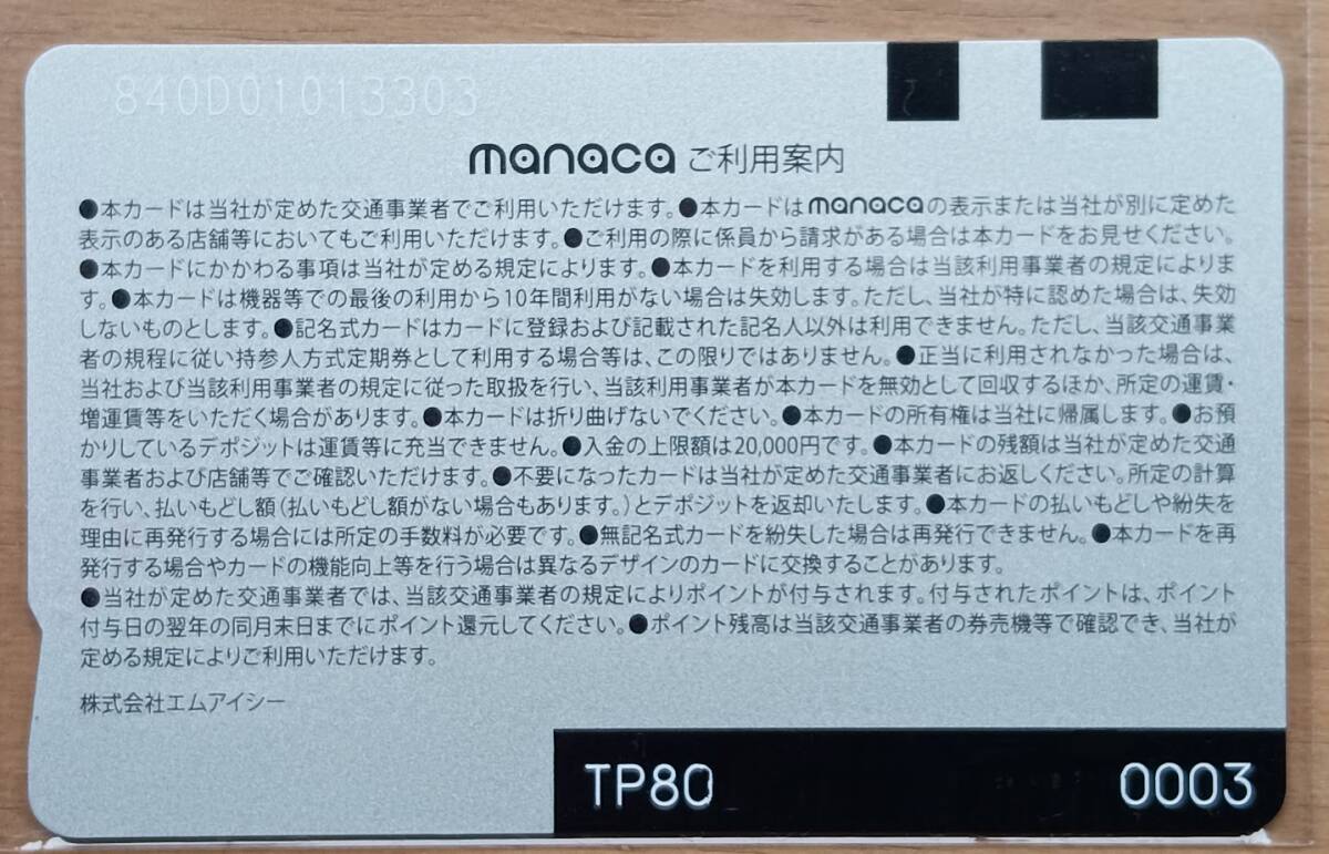 名古屋鉄道のICカード manaca。落札者様でチャージ(入金)の うえ使用可能。新規購入後は写真のようにOPP袋に入れて、1回タッチで 残高を0円にしています。傷はついていないと思われます。 全国の交通系ICカードの相互利用カードです。カード番号の下4桁が 0003です。 |