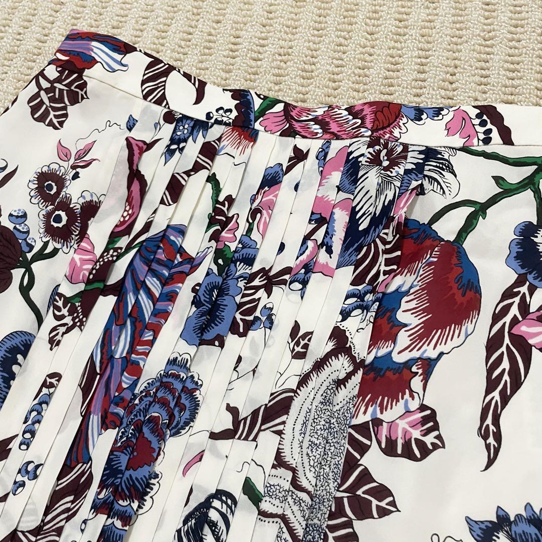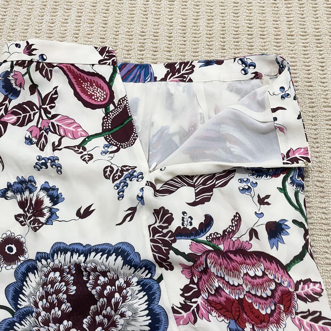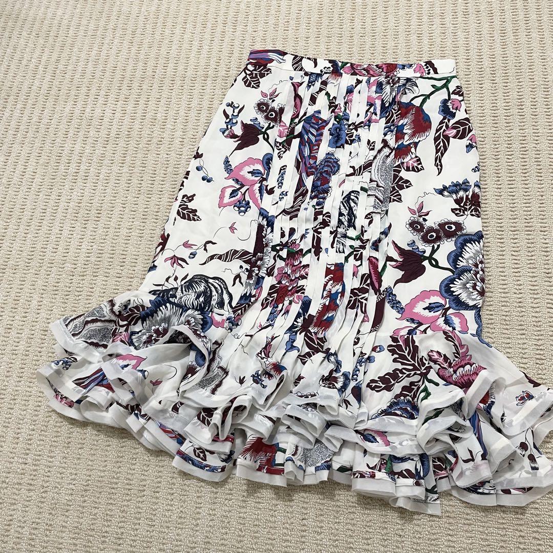 春を思わせる全面のエキゾチックなボタニカルフラワープリント、トリミングのレース使いが大変華やかで目を引く豪華でお上品なスカート 。