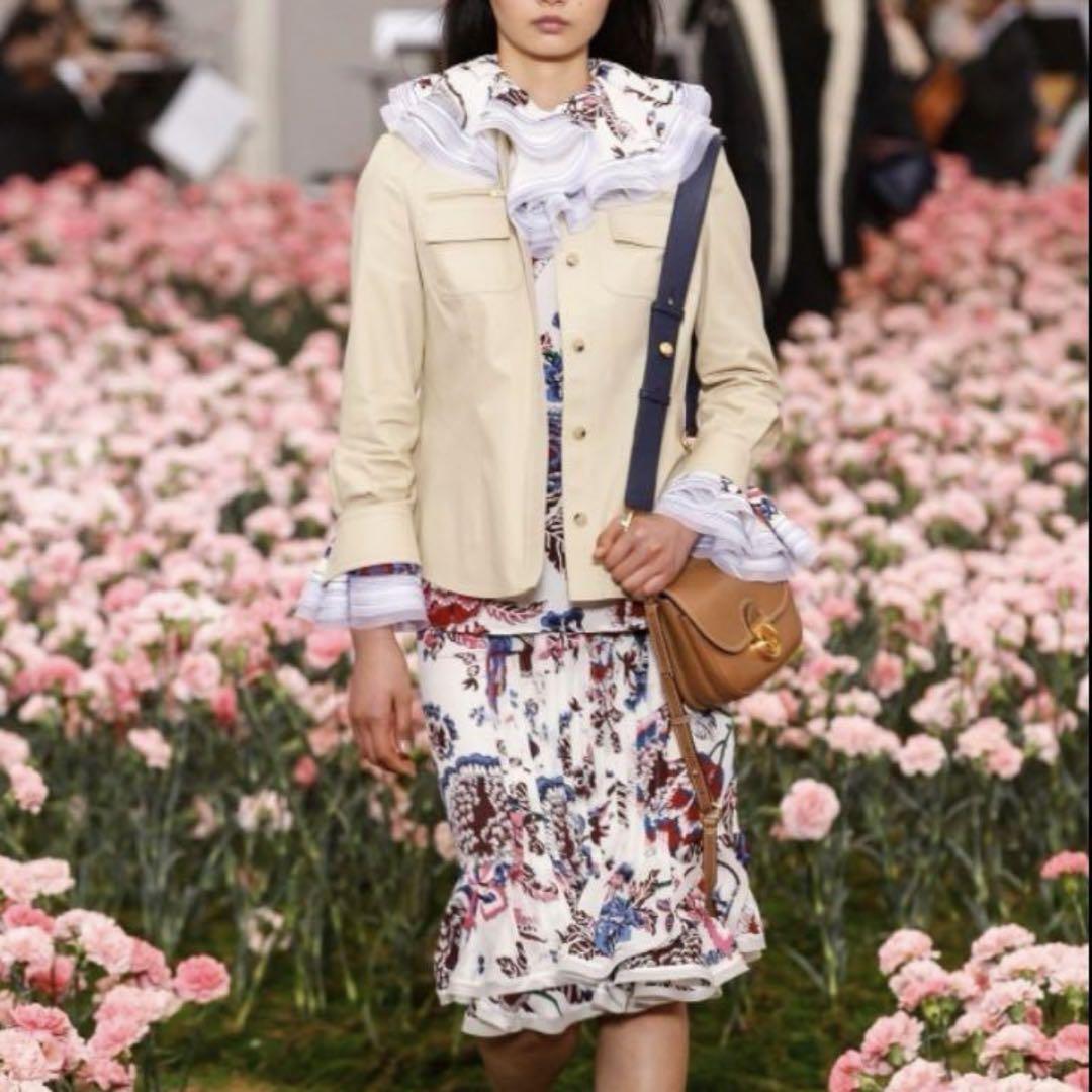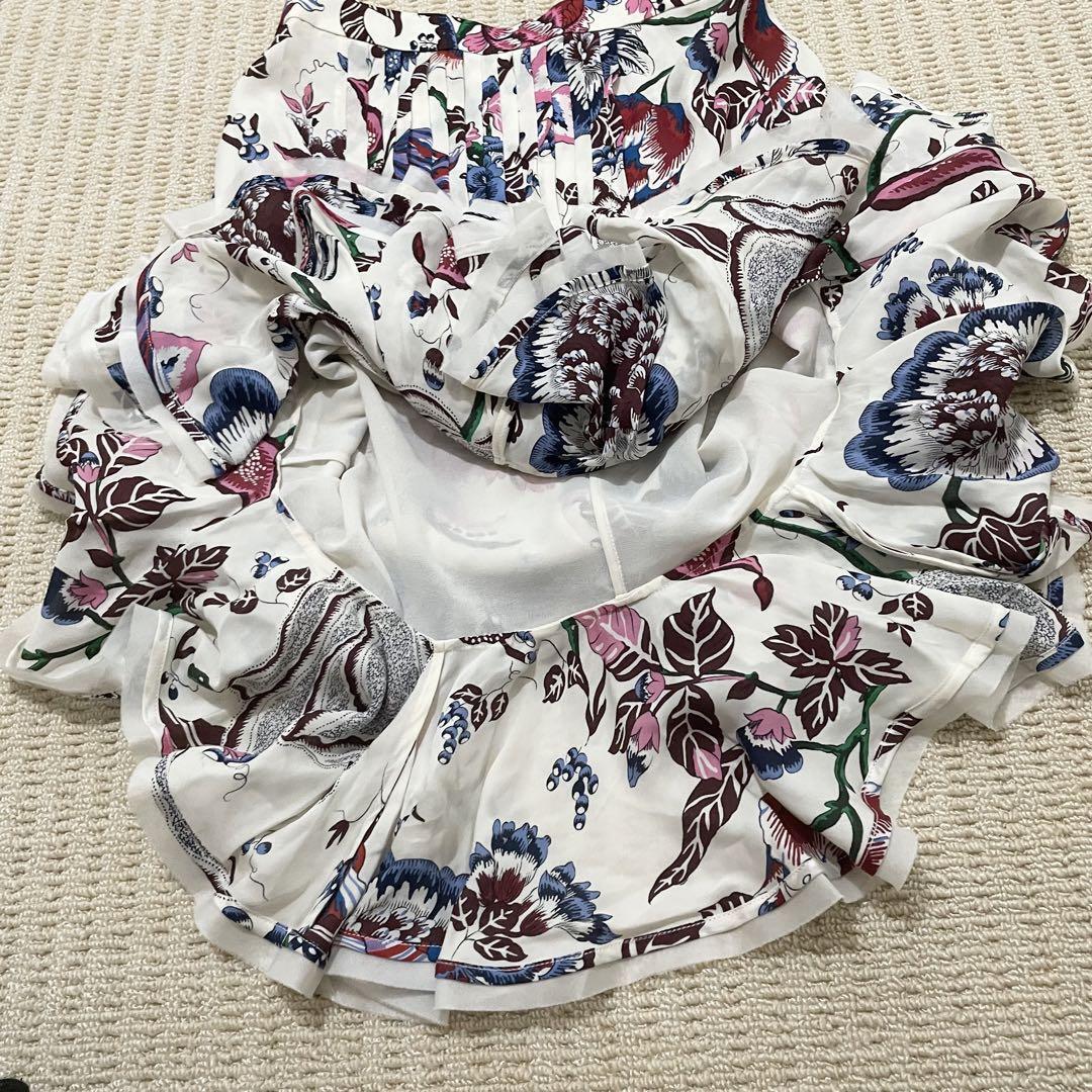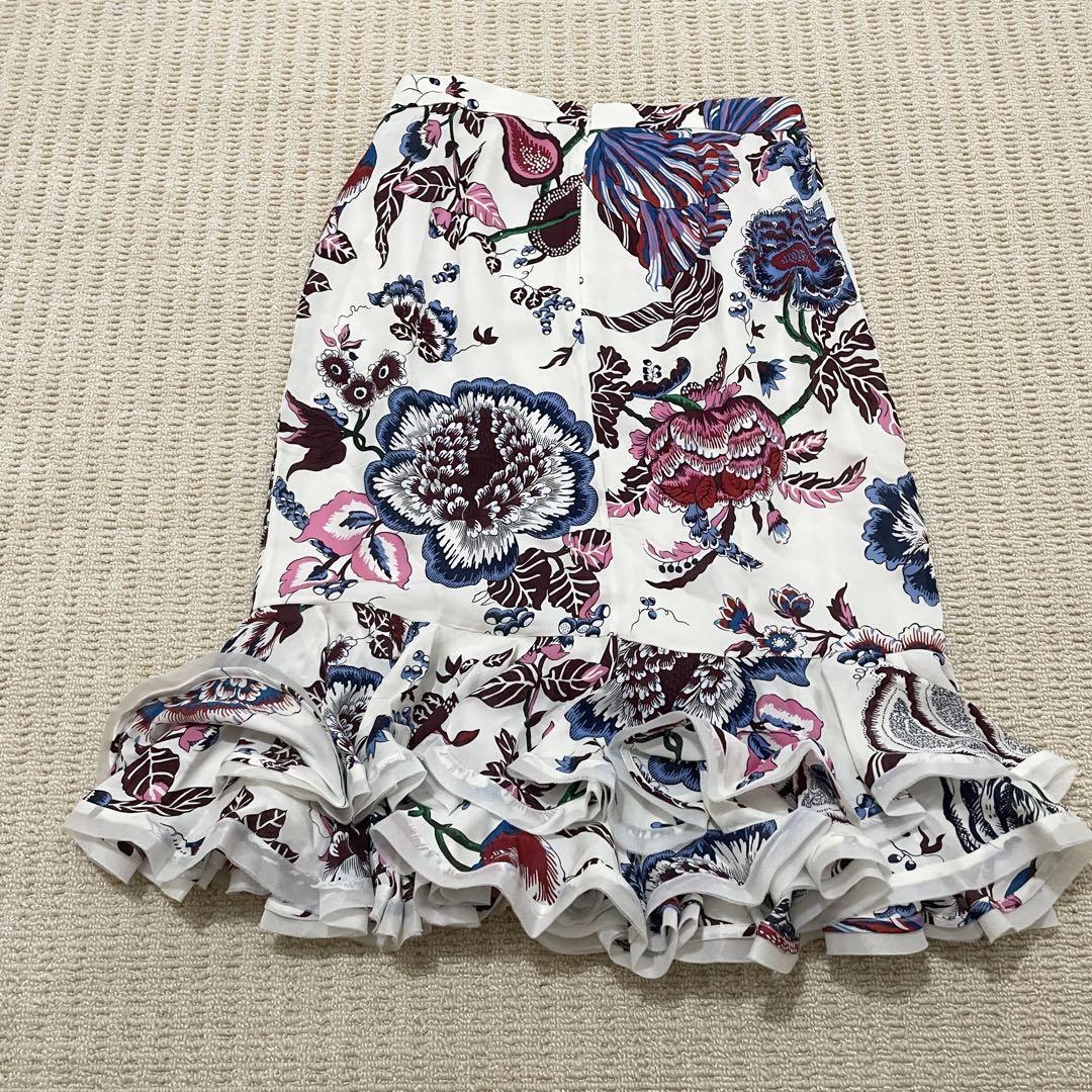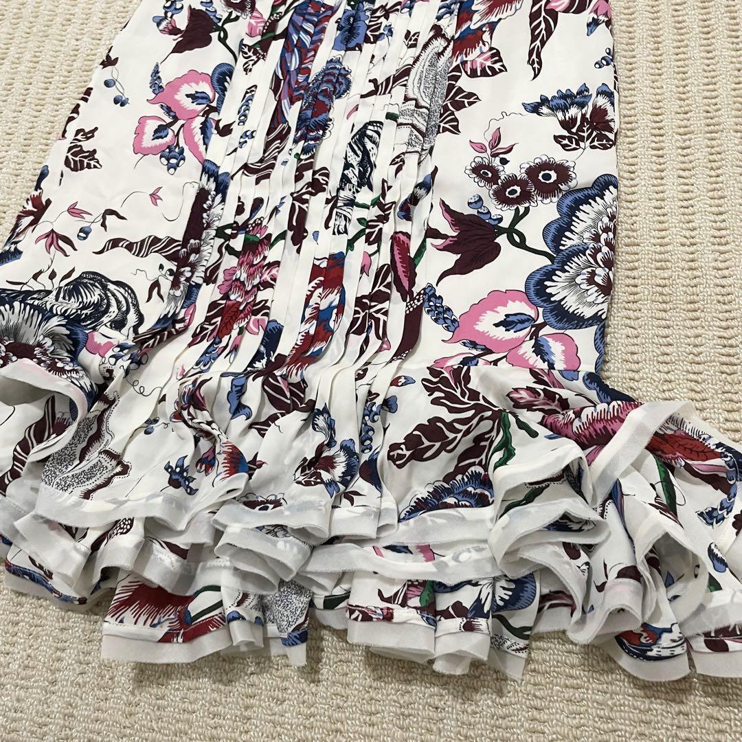 春を思わせる全面のエキゾチックなボタニカルフラワープリント、トリミングのレース使いが大変華やかで目を引く豪華でお上品なスカート 。