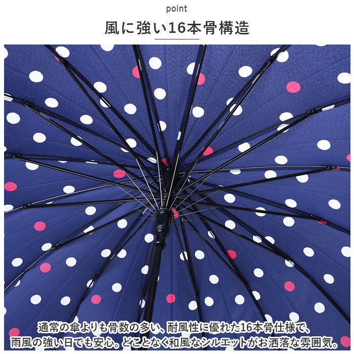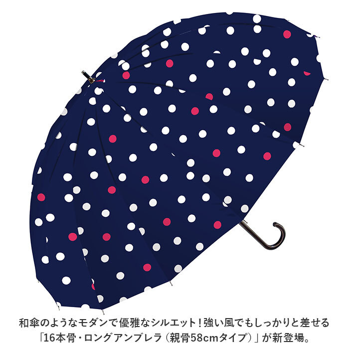 | 商品説明 | ・・和傘のようなモダンで優雅なシルエット!強い風でもしっかりと差せる「16本骨・ロングアンブレラ(親骨58cmタイプ)」が新登場。 ・【風に強い16本骨構造】 ・通常の傘よりも骨数の多い、耐風性に優れた16本骨仕様で、雨風の強い日でも安心。どことなく和風なシルエットがお洒落な雰囲気。 ・【軽くて、しなやか】 ・親骨には、強い風でもしなやかに受け止めるグラスファイバー素材を使用。軽くて折れにくく、持ち運びも楽ちん。 ・【濡れにくいしっかりサイズ】 ・親骨58cm、直径98cmのしっかりサイズで、コートの裾やカバンが濡れにくい!16本骨の程よい重みで風に煽られず、安定した差し心地を実現。 ・【片手で簡単・ワンタッチ】 ・骨の多い傘にありがちな、手で開く不便さを解消。片手に荷物があるときでもワンタッチでパッと開くジャンプ式。 ・【リッチなレザー調ハンドル】 ・ブラウンのレザー調手元ハンドルが高級感のある仕上がり。傘を持つ指先をたおやかに演出する華奢なフォルムが魅力。 ・【たたむ時も手間取らない!】 ・傘生地がスムーズにまとまる、スナップボタンタイプの留めバンドを採用。 ・【心華やぐカラーバリエーション】 ・どんなファッションにも合わせやすい、華やかで親しみやすいテキスタイルをラインナップ。傘の波の中でも自分らしさが際立つ、自分だけの1本が見つかる♪ |