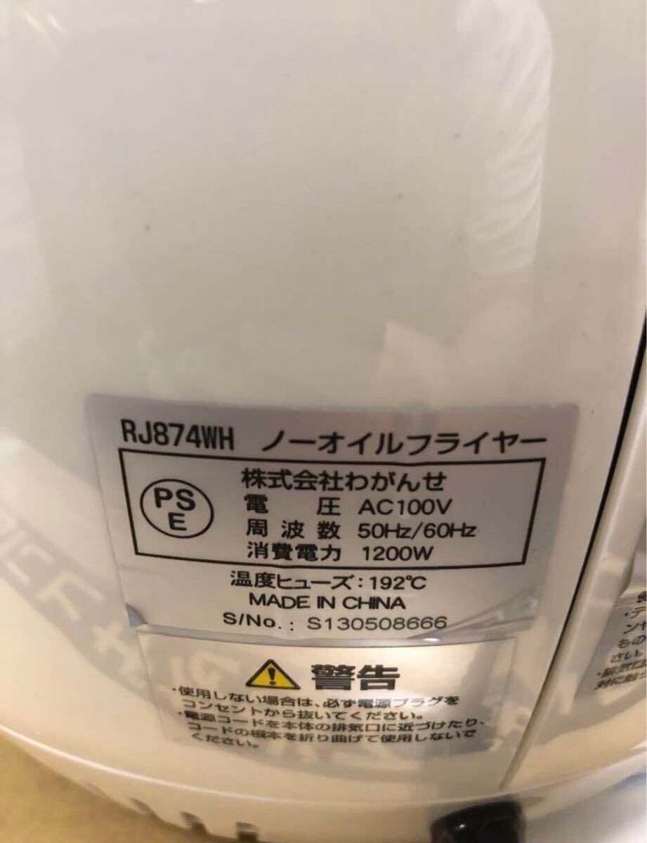 わがんせ 電気フライヤー ノーオイルフライヤー ホワイト 型番:RJ874WH 年式:2013年製 動作確認済みです。 付属品は写真上判断してください。 |