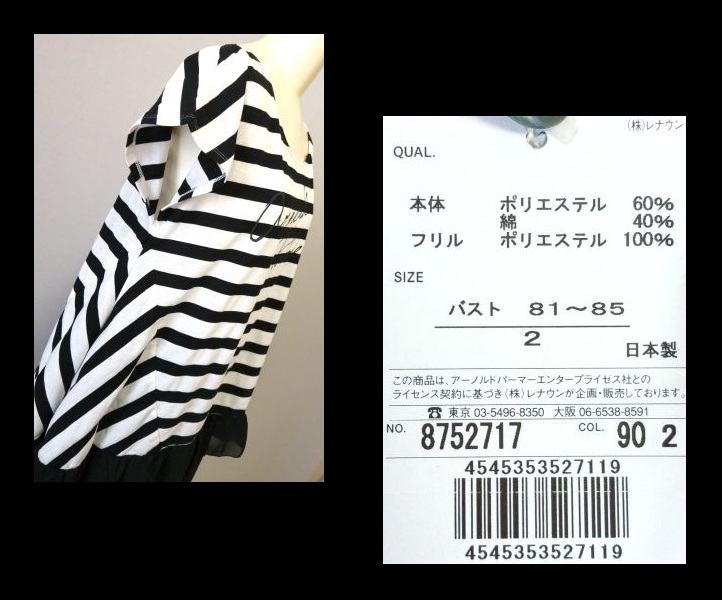 商品紹介 | ★表示サイズ…2(バスト81-85) ★素材 本体…ポリエステル60% 綿40% フリル…ポリエステル100% ★日本製 ★(株)レナウン ★お色…黒×白ボーダー ・裾フリル付き ・重量…140g ★実寸(多少の誤差はご了承ください) 身幅:47㎝ 着丈:70㎝(フリル含む) ●土日祝日年末年始は発送できませんのでご了承ください。 ●画像の色合いは撮影環境、モニター環境により実物と若干異なる場合がございます。予めご了承ください。 まとめて取引は最初の落札から72時間が対象です。 最初の落札商品の取引ナビで同梱希望の旨をお知らせください |