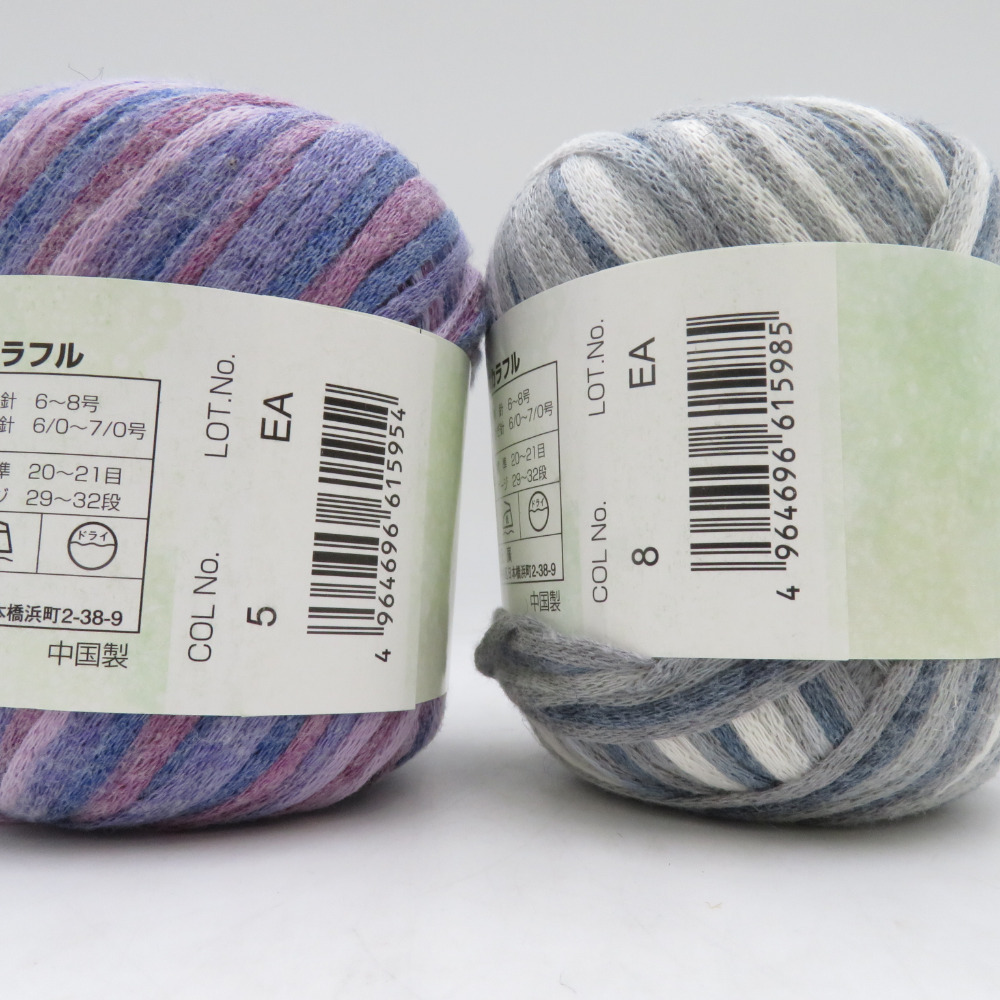| 商品説明 | 軽くて編みやすいテープヤーンです。 淡い柔らかなカラーですので、ファッションのポイントになる小物づくりにおすすめです。 ◆容量:1玉約25g玉巻(約67m) ◆使用針:棒針6~8号 かぎ針6/0号~7/0号 ◆標準ゲージ:20-21目・29-32段 ◆COL(色番):2番色×3玉、3番色×3玉、4番色×2玉、5番色×1玉、8番色×1玉 | ||