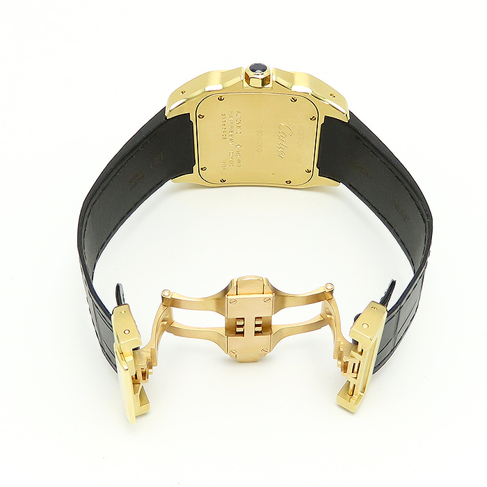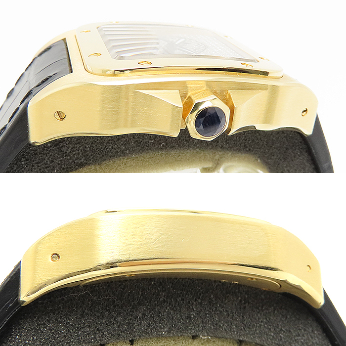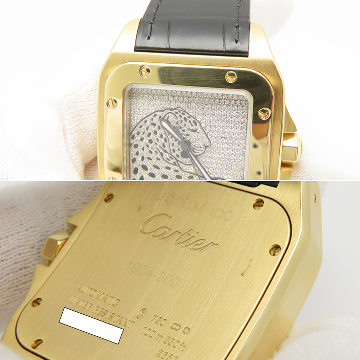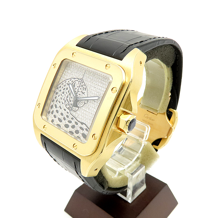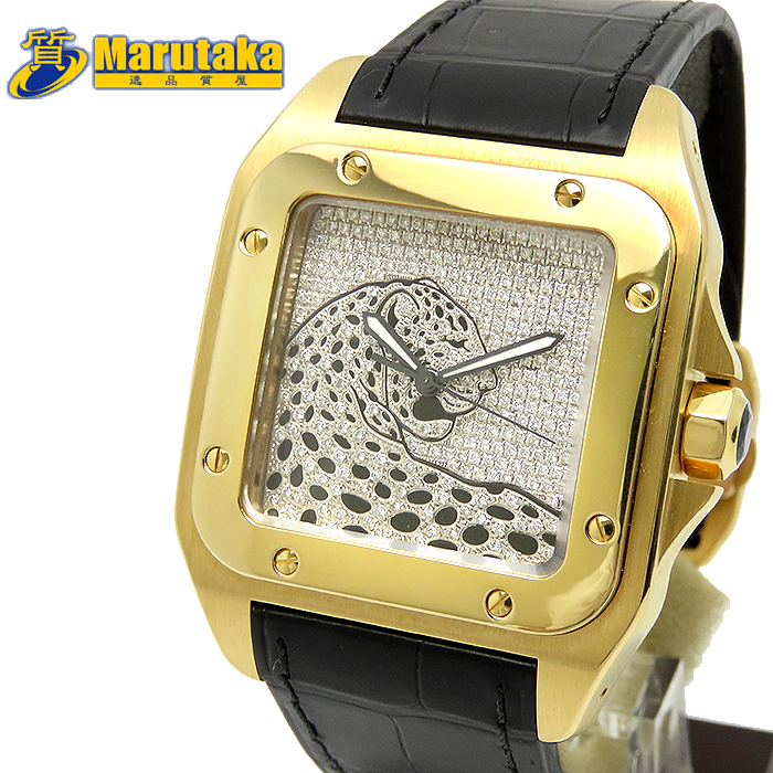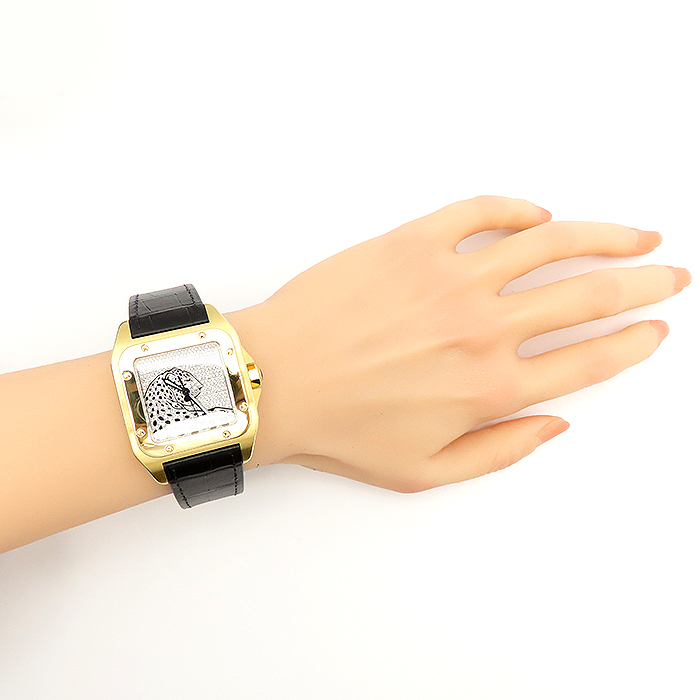 商品説明 | 飛行士サントス・デュモンの依頼により作られた、現在でも不動の人気を誇るサントスウォッチ、その100周年の年に誕生した「サントス100」のYGモデルです。通常のサントスの高級感は残しつつ、より力強く重厚感のあるデザインとなったモデルです。こちらの商品は別注で制作されたパンサーモチーフのダイヤ文字盤をセッティングした他にない商品となります。革ベルトも新品のものをセットしており、状態的にも申し分のない商品です。 |