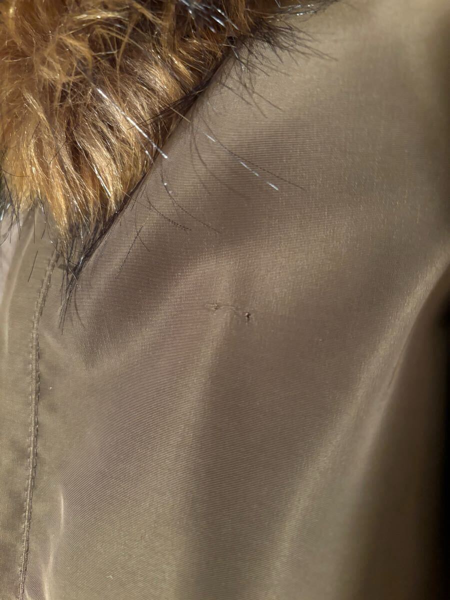 ボタンに小傷あり、左胸に缶バッジを付けた跡があります。
