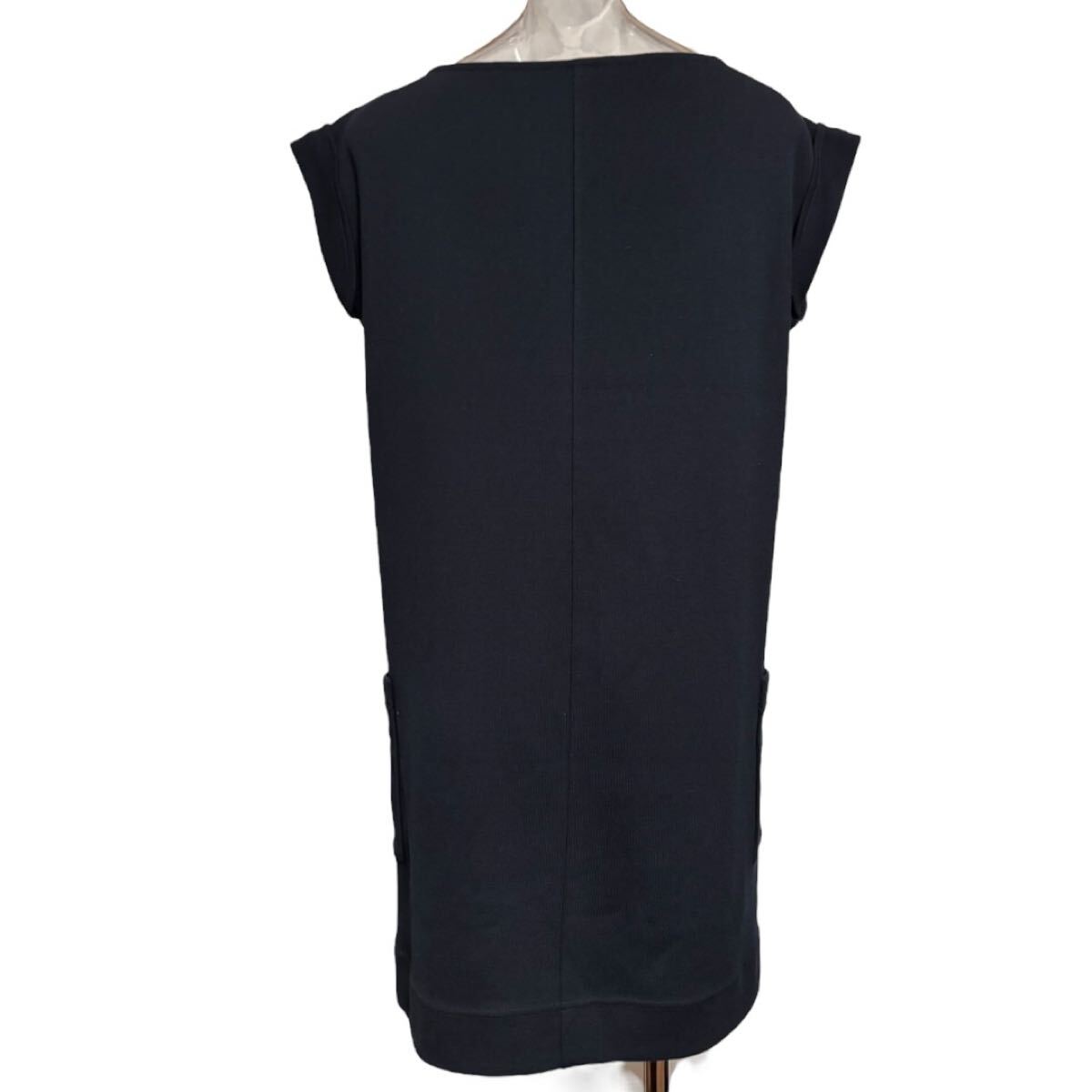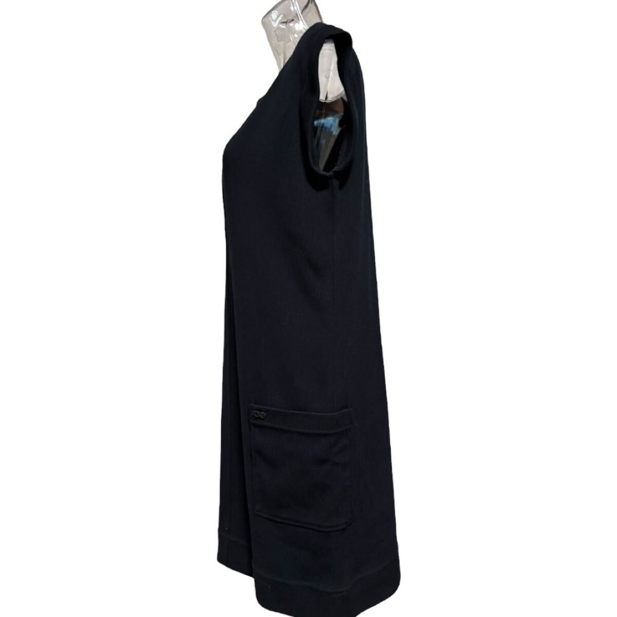 シンプルでエレガントな黒のノースリーブワンピース、2つのポケット付きで実用性も兼ね備えています。
