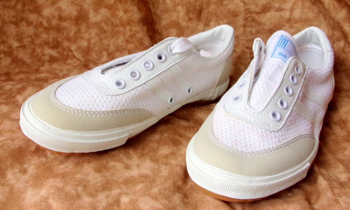 ベルスターブランドの白の上履きです。紐靴タイプ、飴色底です。