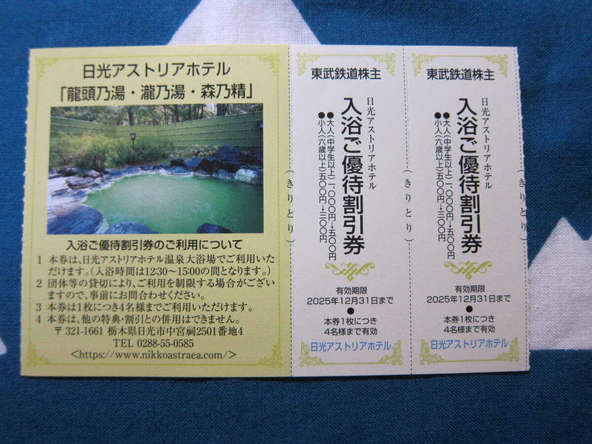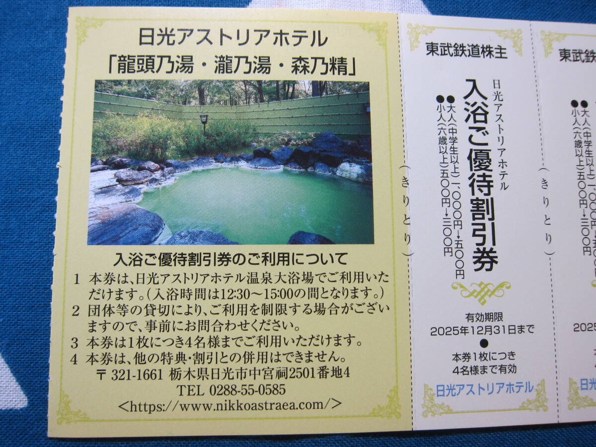 株主優待 東武鉄道 日光アストリアホテル  龍頭乃湯 瀧乃湯 森乃精 入浴料割引券 2枚 有効期限2025/12/31日まで その1/3