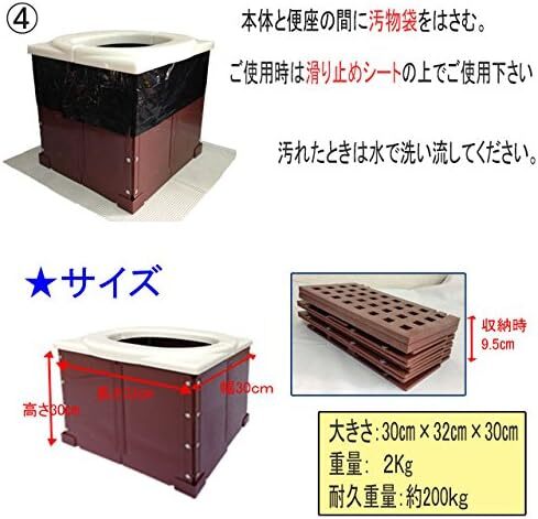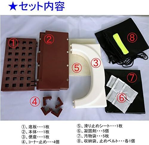 ・便座…1枚 ・底板…1枚 ・本体…1枚 ・便座…1枚 ・コーナー止め…4個・滑り止めシート…1枚 ・凝固剤(12g)…5個 ・汚れ物袋…5枚 ・収納袋、止めベルト…各1個 【サイズ】 大きさ(約):幅30cm×奥行き3cm×高さ30cm重量:約2kg 耐久重量:約200kg