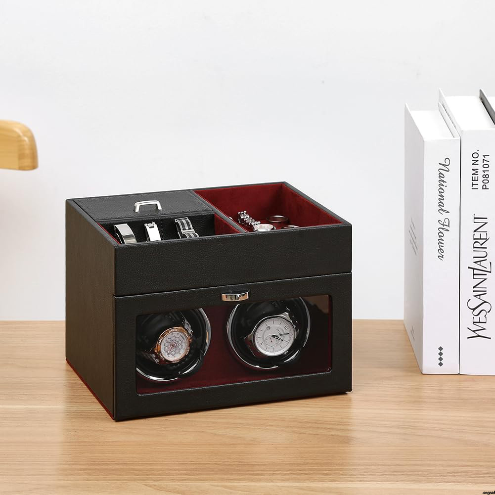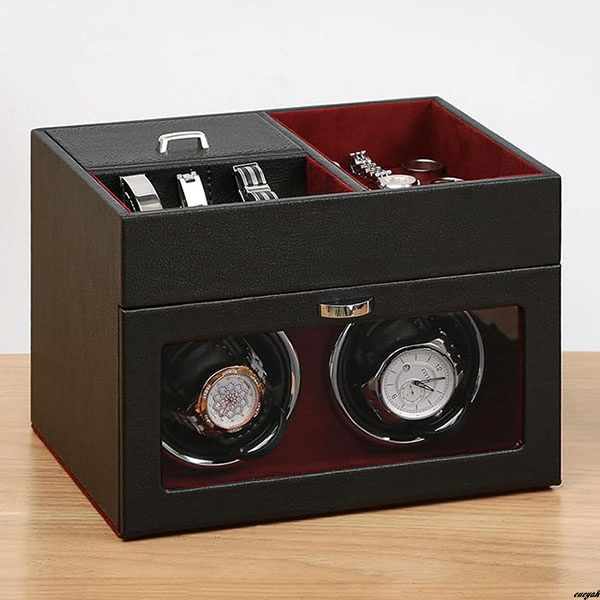 このワインディングマシーンは、2本の自動巻き腕時計を同時に巻き上げられる設計で、日々の腕時計管理をスマートにサポートします。