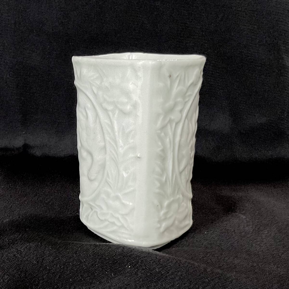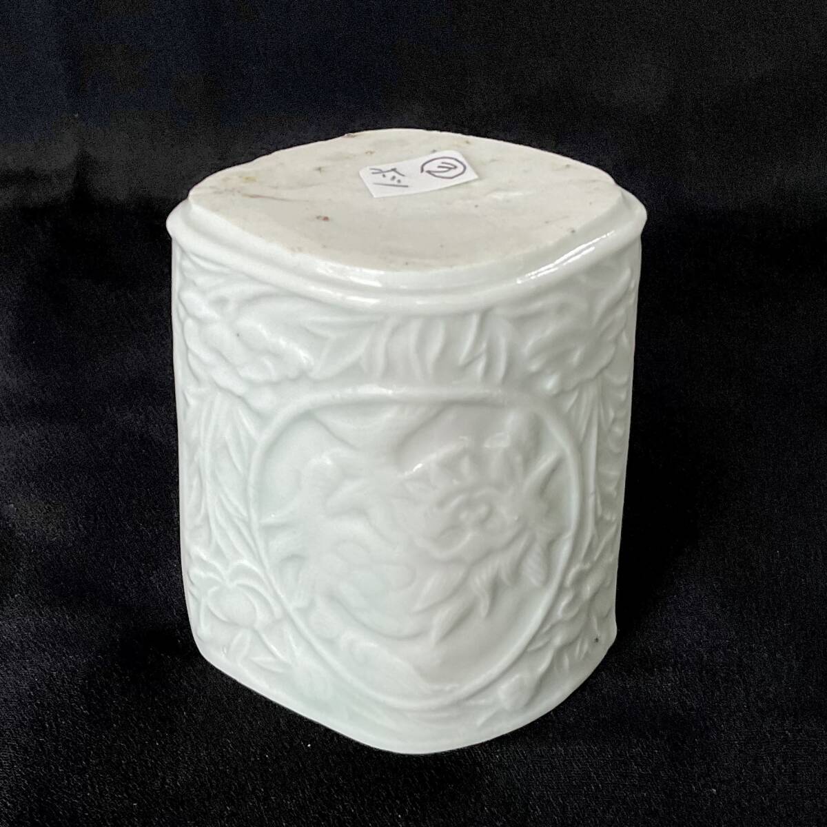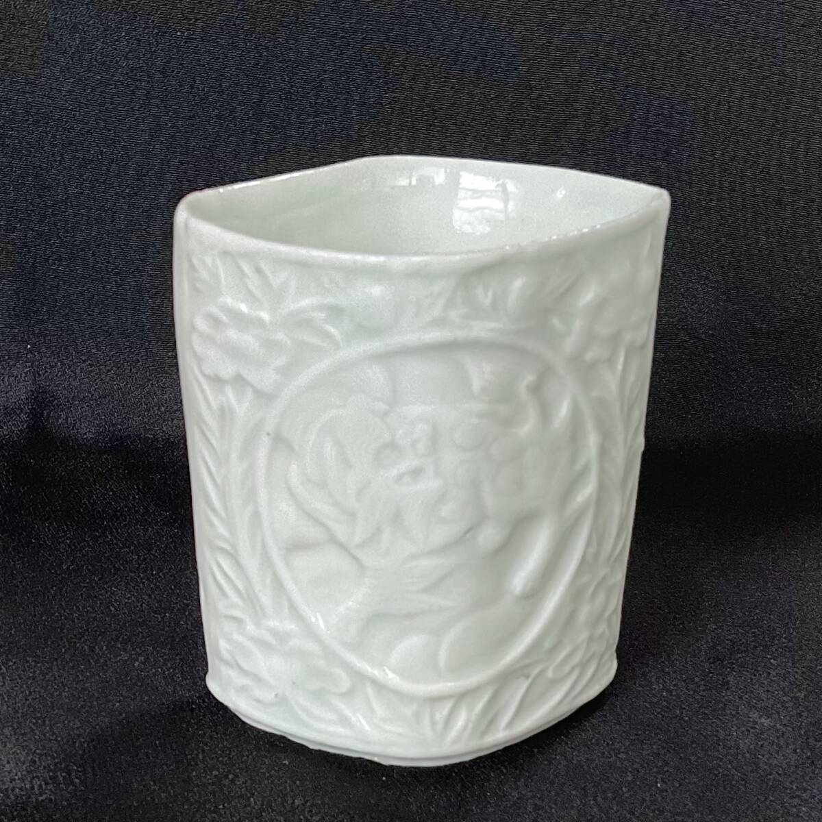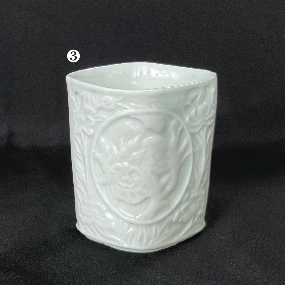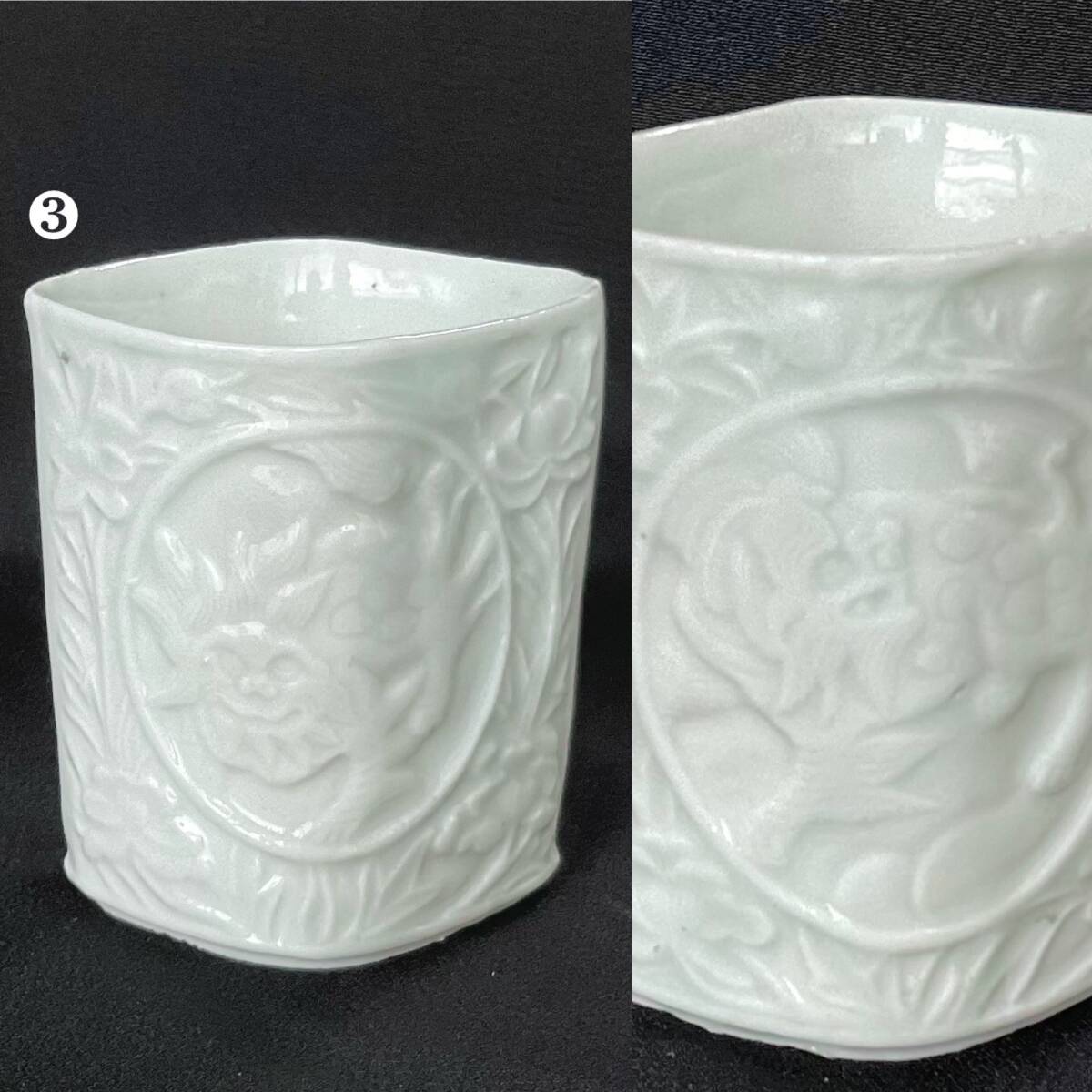 古伊万里:古九谷白磁陽刻唐獅子牡丹菱形筒向付筒猪口ぐい呑み③
