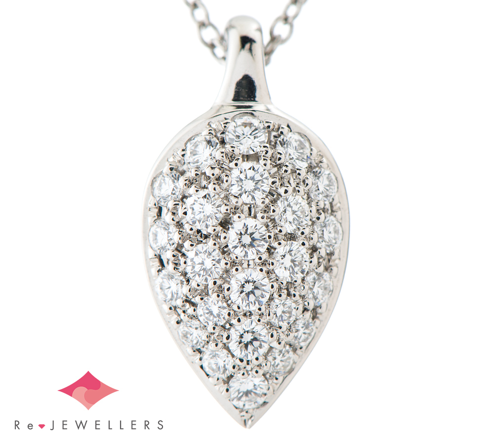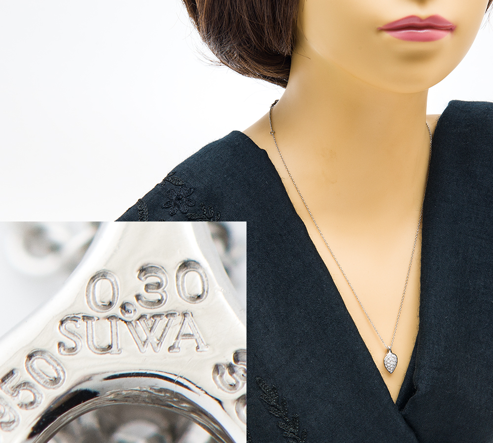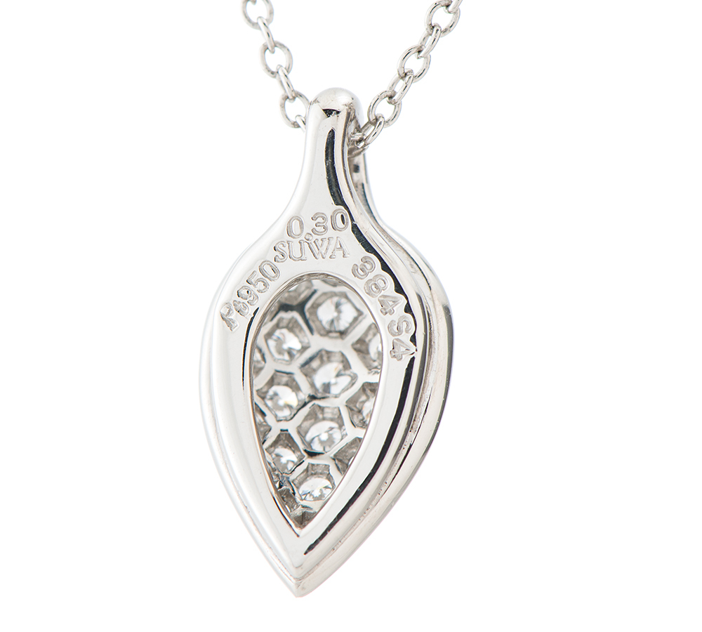 シンプルながら、洗練されたデザインが美しいSUWAのペンダント・ネックレス。葉のような形をした丸みのある柔らかなフォルムに、美しくパヴェセッティングされたダイヤモンドが眩い煌めきを放ちます。素材、つくり、デザイン全て妥協のないクオリティに「受け継ぐ人に喜ばれること」というSUWAブランドのコンセプトが表れています。末永く楽しんで頂ける気品溢れるジュエリーです。