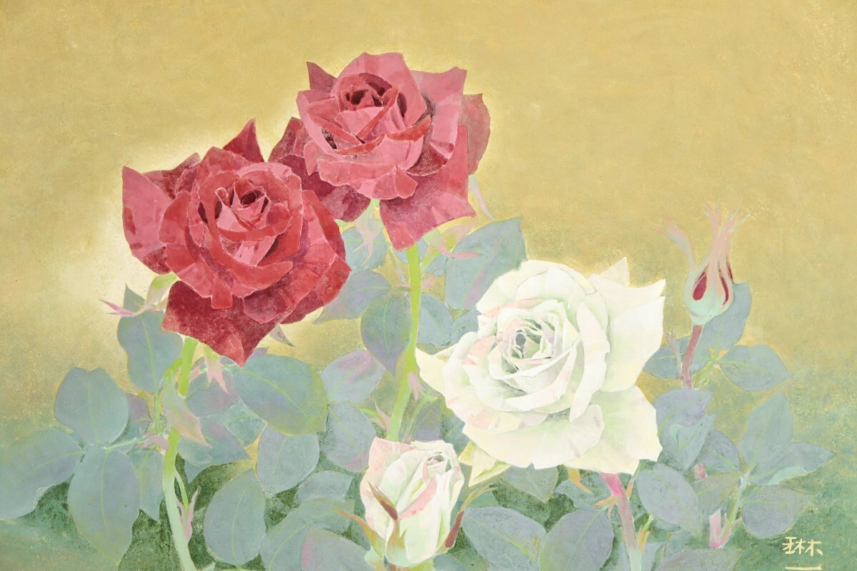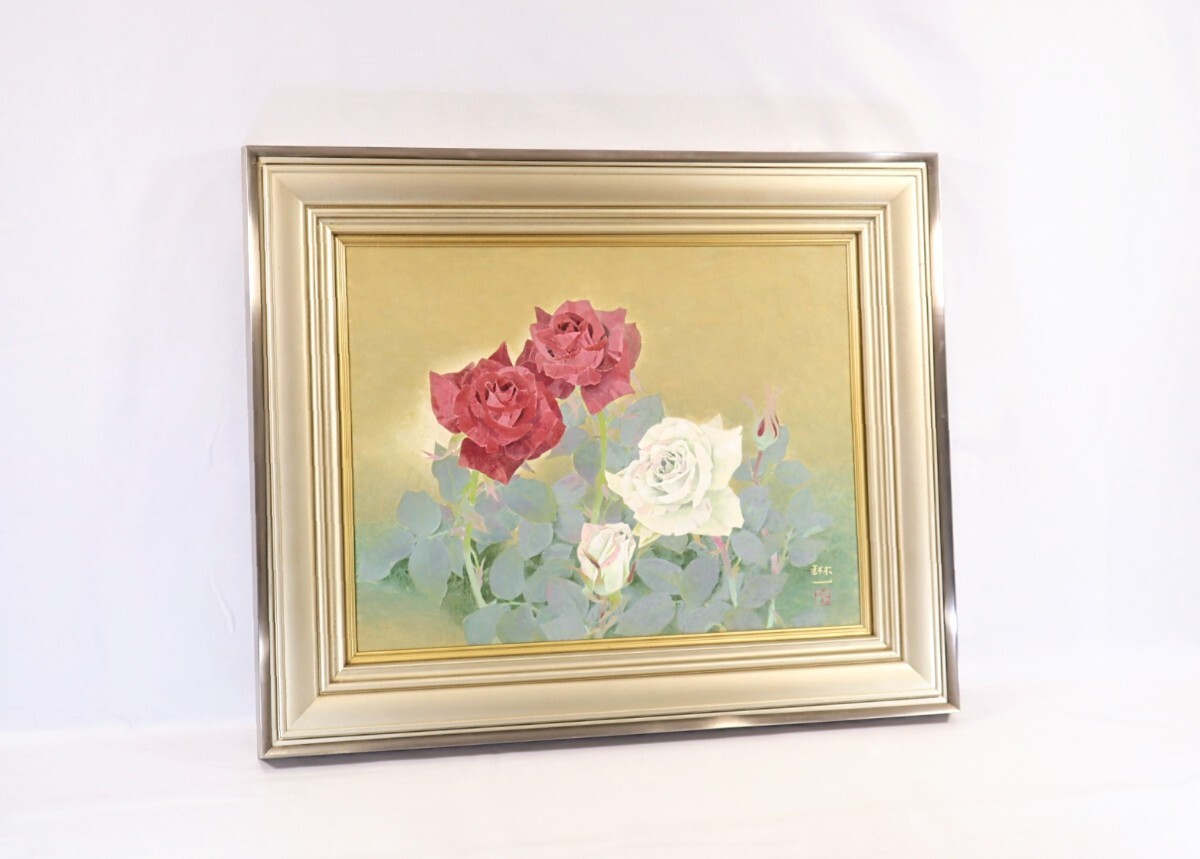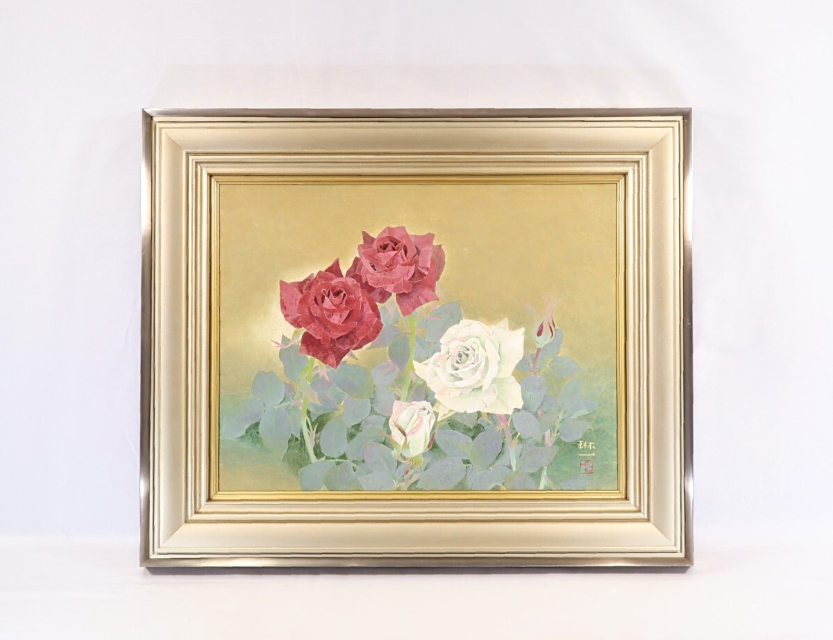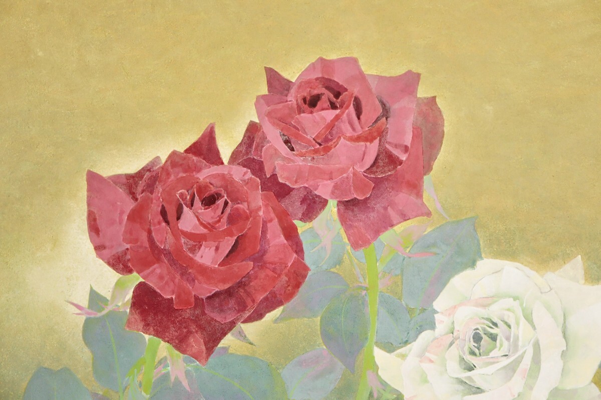 真作 間瀬琳一 日本画「薔薇」画寸10号 愛知県出身 名古屋芸大教授 川端龍子 西山翠嶂に師事 柔らかな色使い 繊細な質感を丁寧に表現 11028