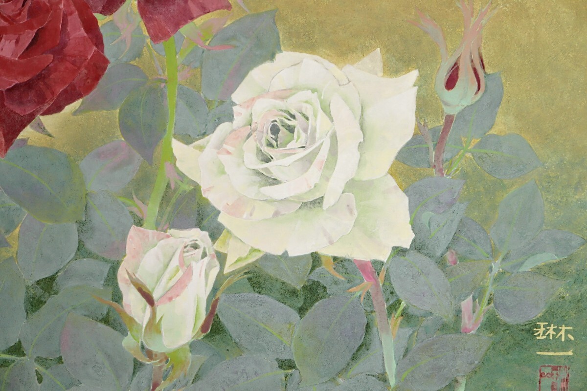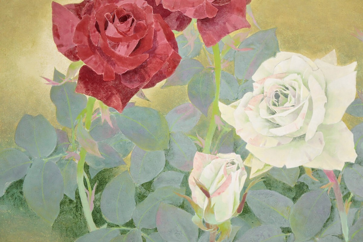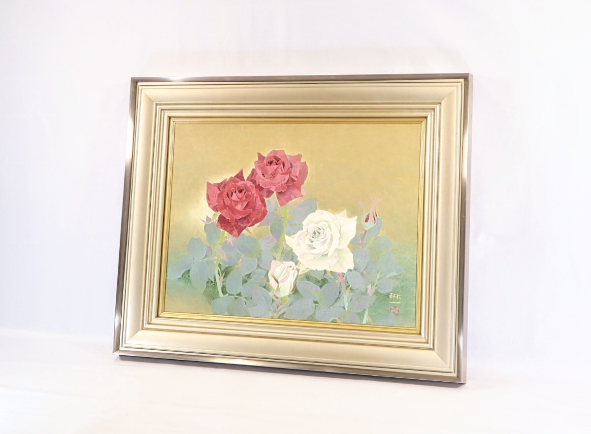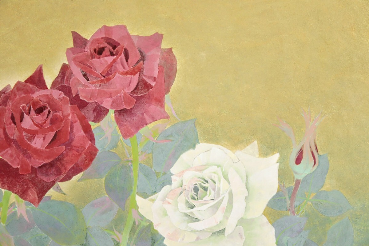 真作 間瀬琳一 日本画「薔薇」画寸10号 愛知県出身 名古屋芸大教授 川端龍子 西山翠嶂に師事 柔らかな色使い 繊細な質感を丁寧に表現 11028