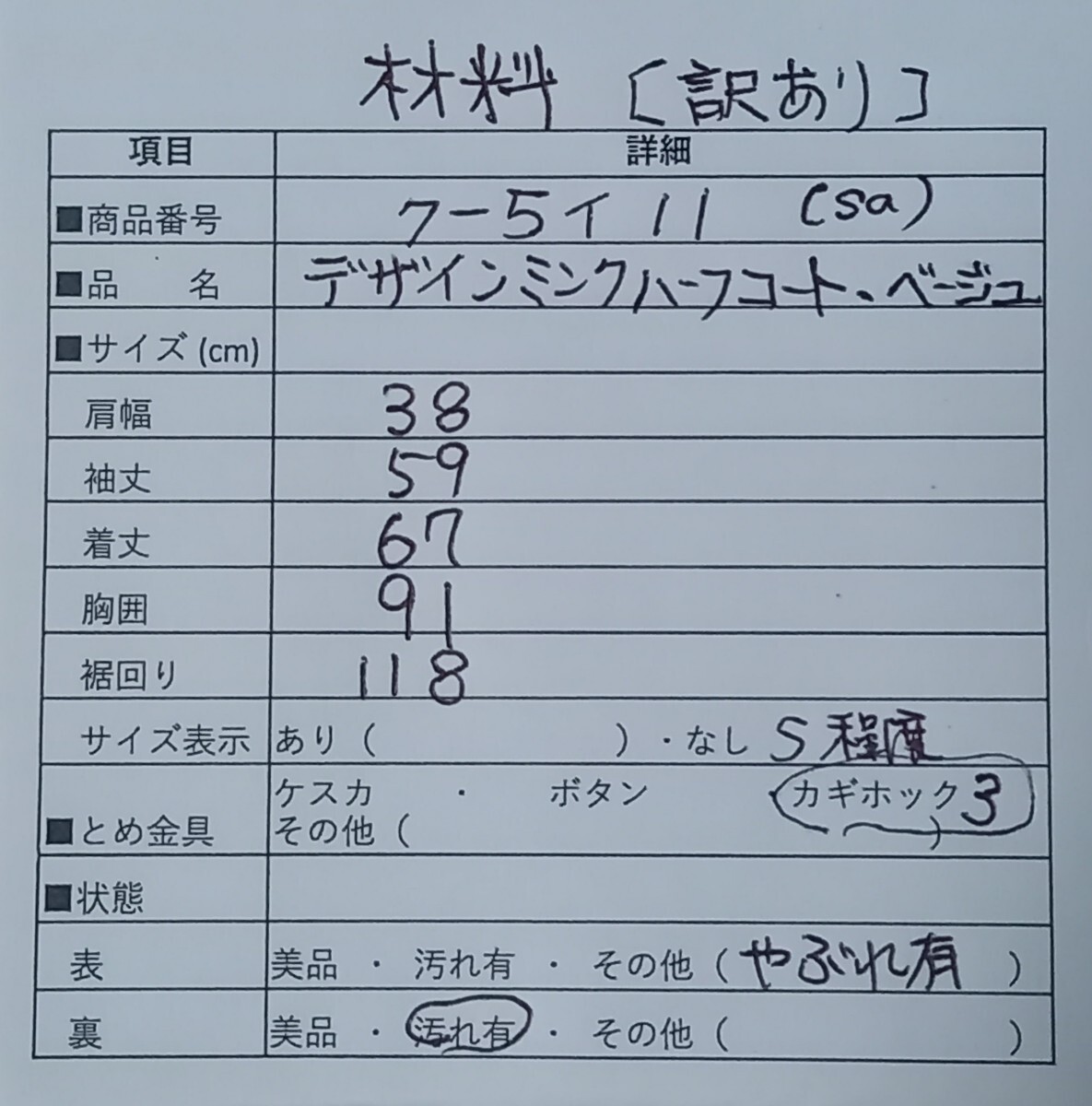 【毛皮●jur-an】ヤフオク店 特別企画SALE!!! デザインミンクハーフコート・ベージュ系【訳アリ】 | |