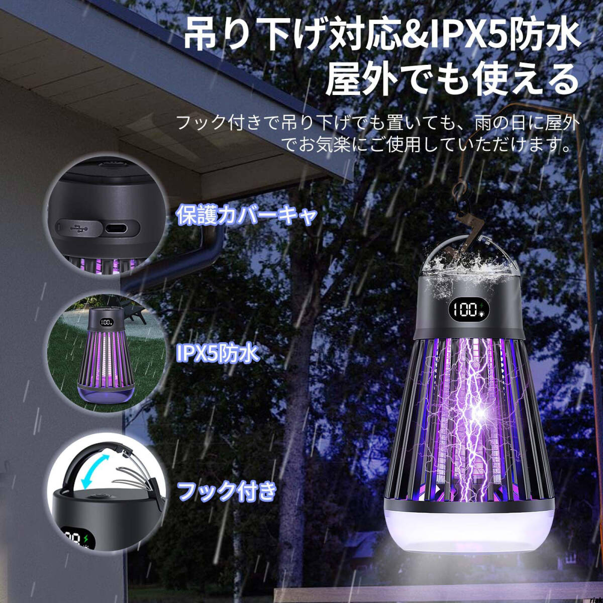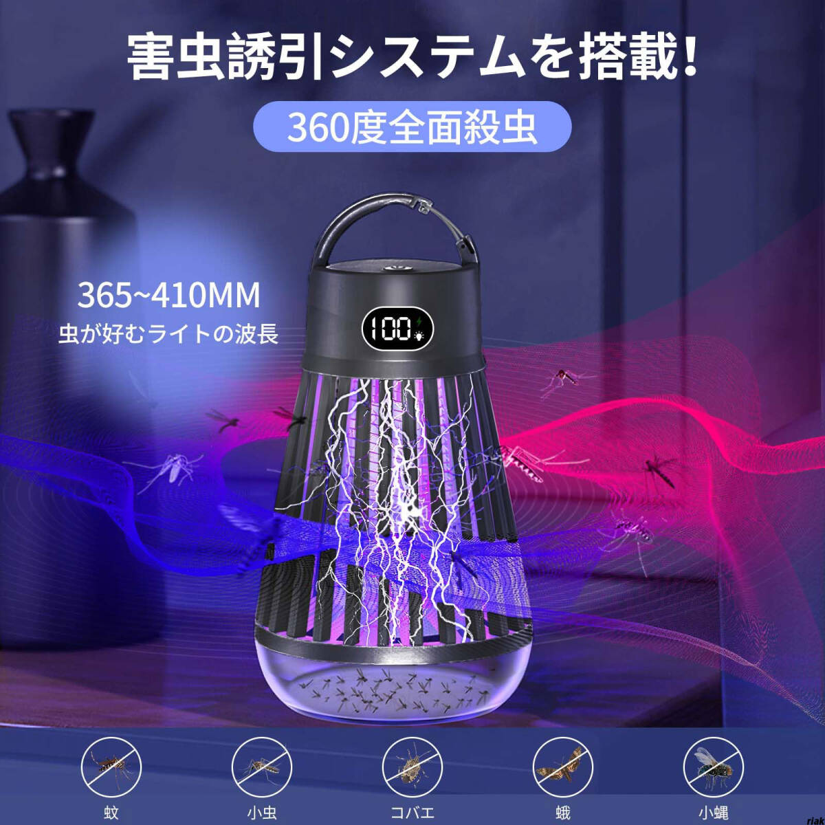 【安全・静音 360°UV誘引電撃殺虫器】 UV誘虫灯 薬剤不要 省エネ蚊取り器 吊り下げ式 電撃殺虫器 屋内 屋外 ブラック