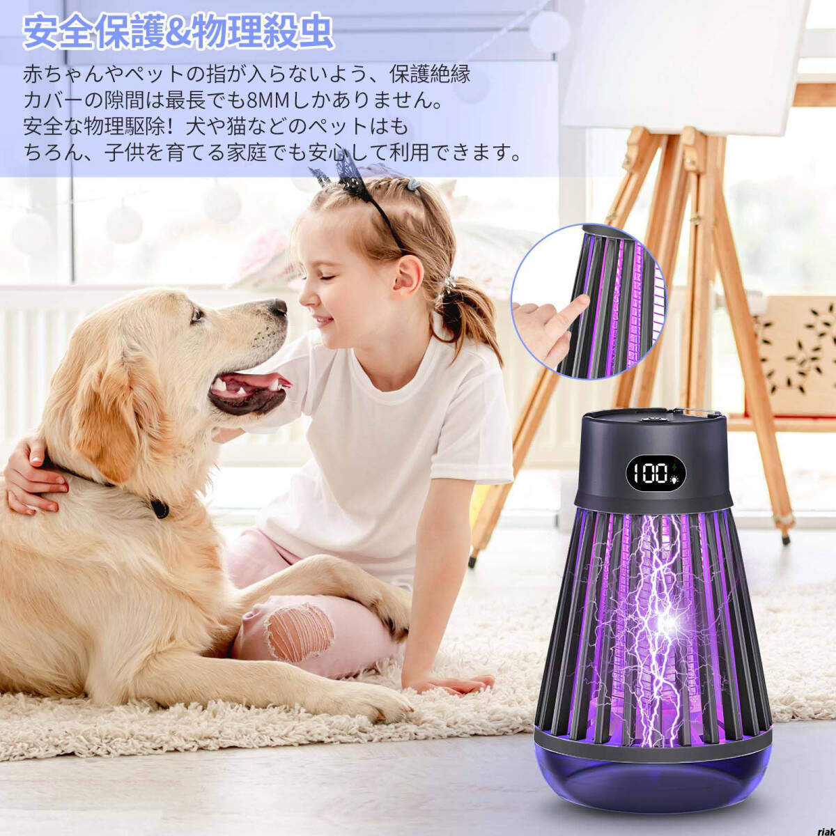 薬剤を使わず無臭・無毒の物理殺虫方式で、ペットや子供にも安心して使えます。