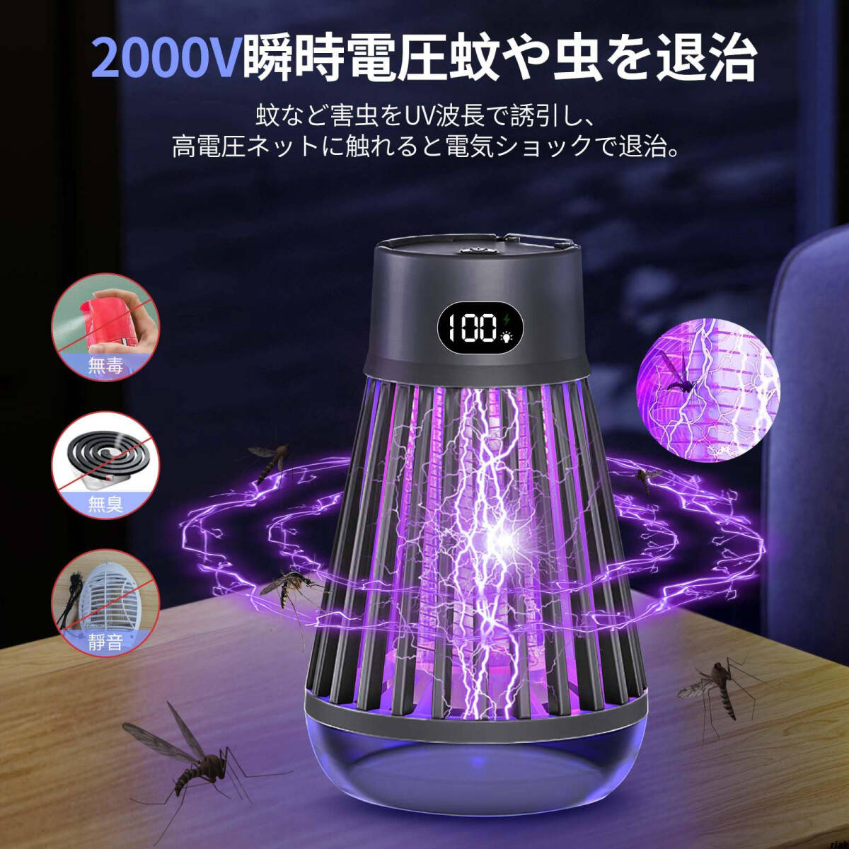 365nm〜410nmのUV光源が蚊や蛾、コバエなど多種の害虫を効果的に引き寄せ、2000Vの高圧グリッドで即座に撃退。