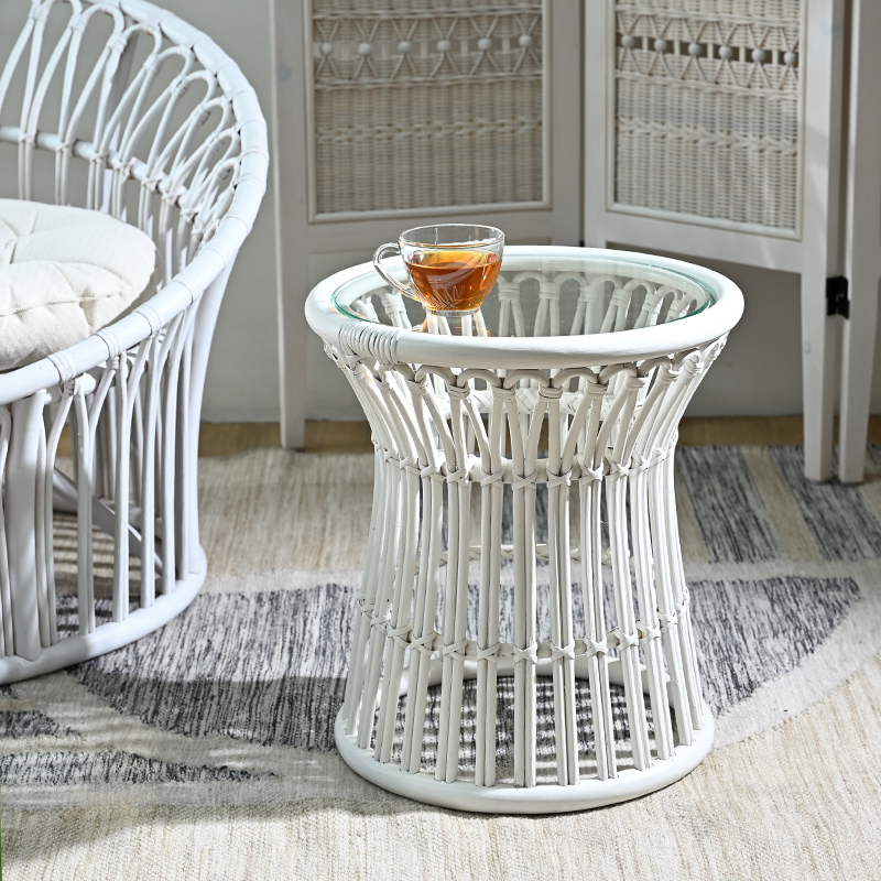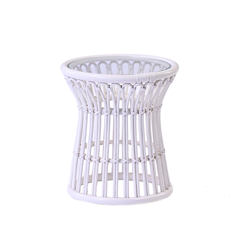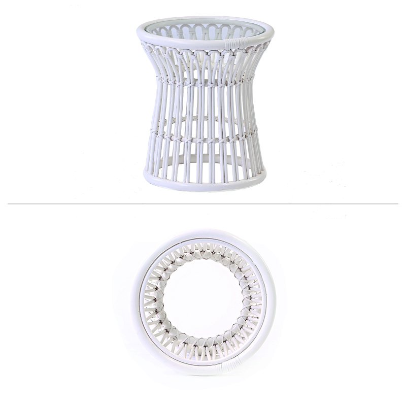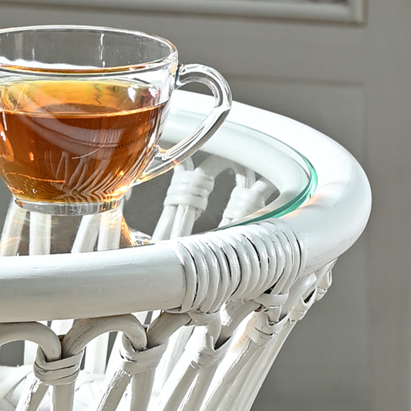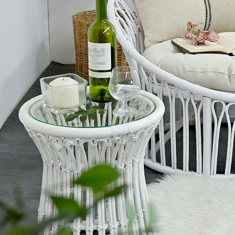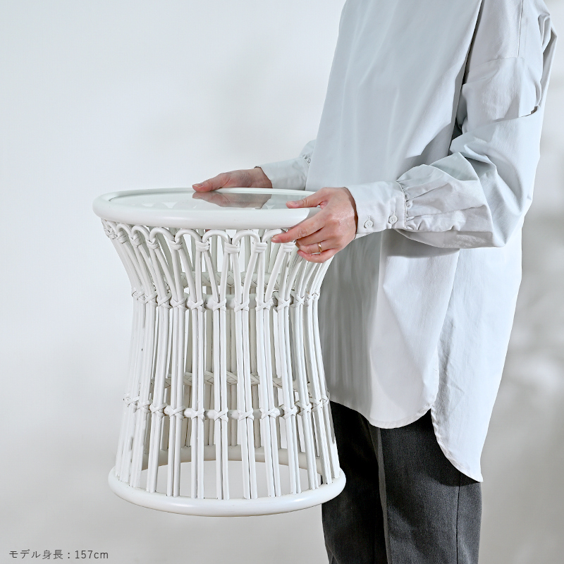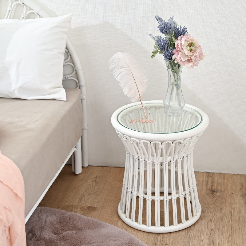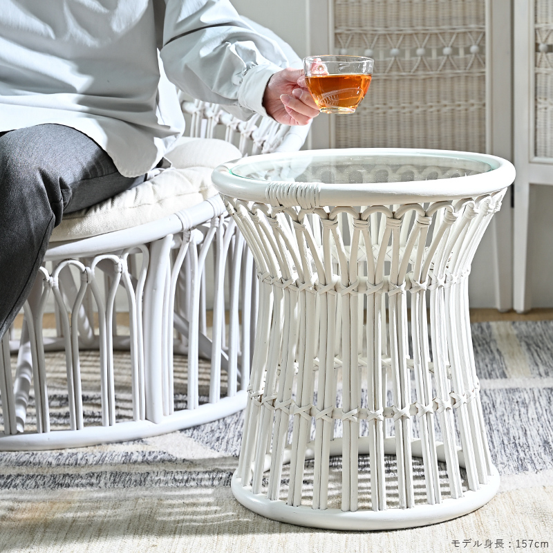 籐サイドテーブル 円形ガラステーブル 直径38cm 丸テーブル ホワイトウォッシュカラー T851WW