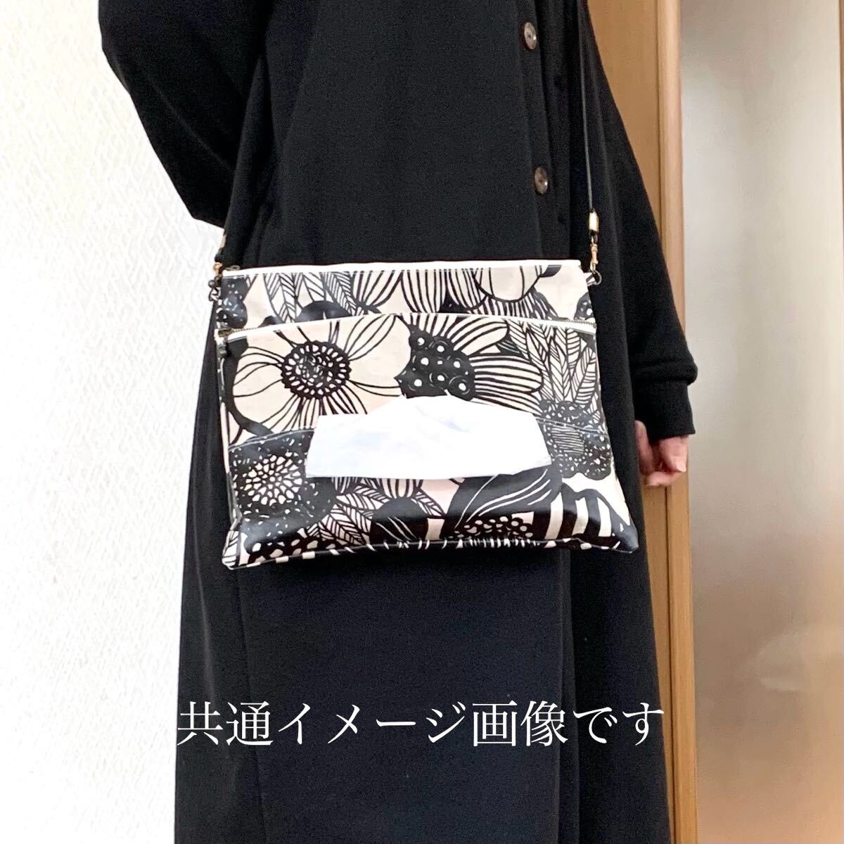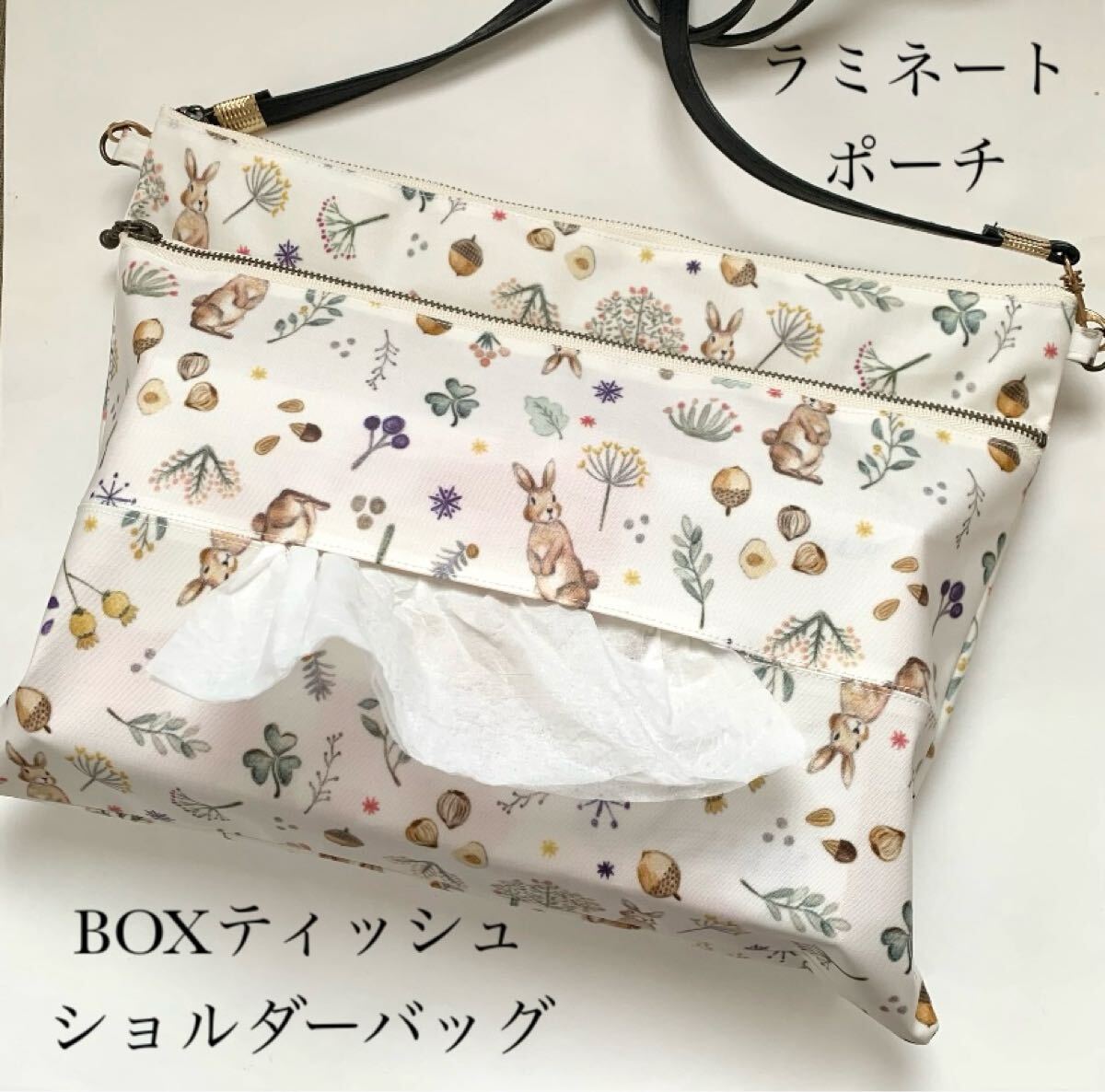 ラミネート生地の軽くて丈夫なBOXティッシュが入るショルダーバッグです。