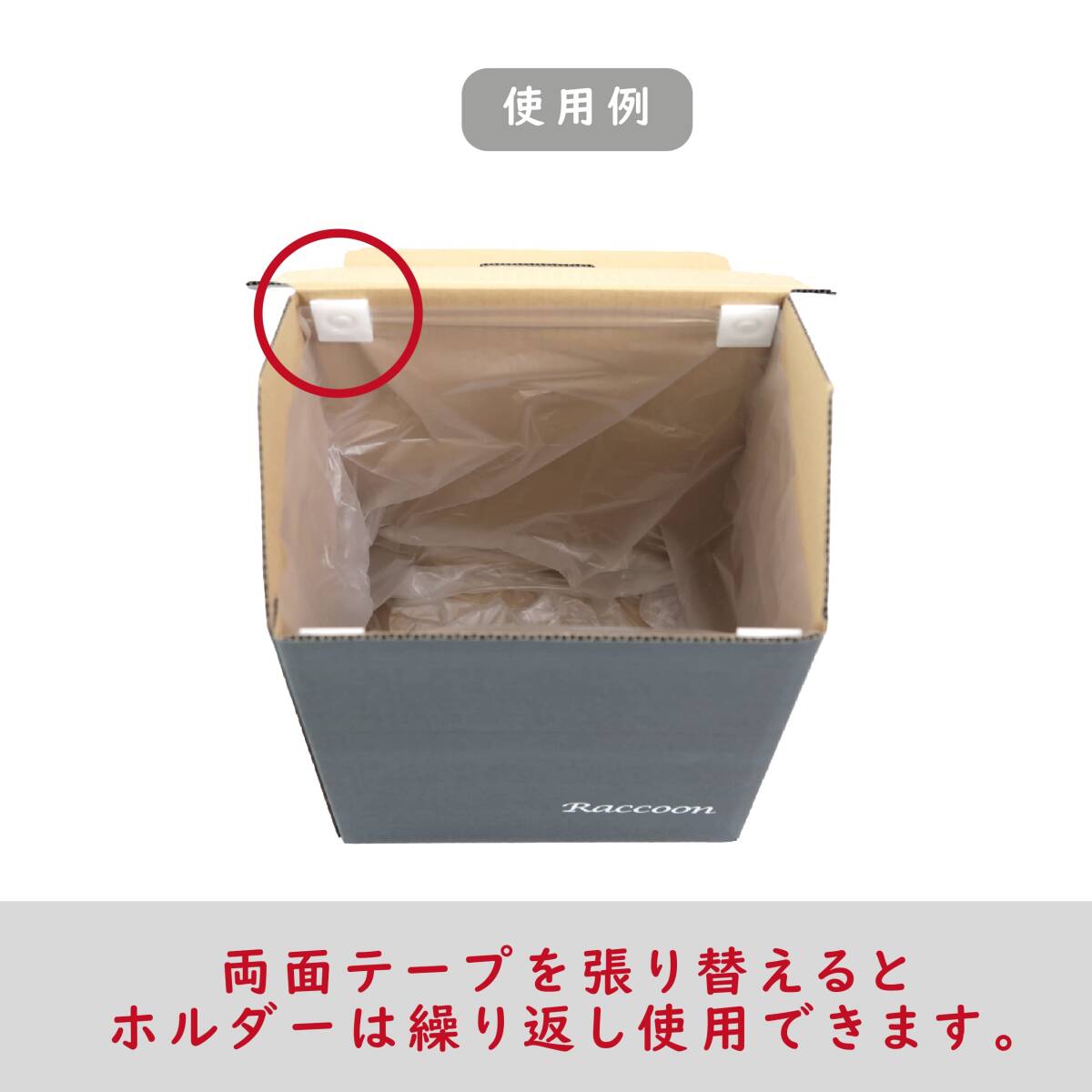 説明 ゴミ箱の内部に固定し、ゴミ袋が外にはみでないようにするホルダーです。裏面の両面テープを張り替えると、繰り返して使用できます。