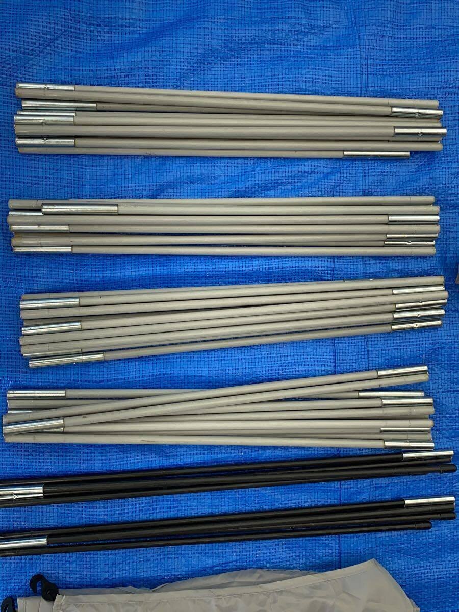 | 全体的に目立つ汚れが多数ございます。 ポール全体に目立つキズ・汚れ、 ポール(黒)の先端に割れがございます。 ペグに使用感があり、2本曲がっております。 付属品:本体 サイドウォール×2 ポール×6 ケース×2 キャリーバッグ |