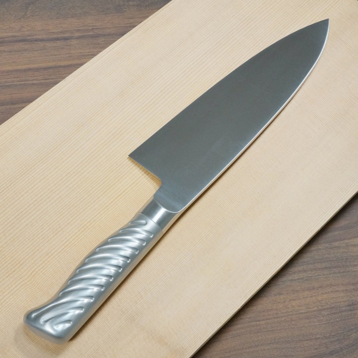 握りやすいトルネード模様がハンドルの片面に施され、見た目の美しさだけでなく、水や油のついた手で握っても滑りにくくなっています。中空のハンドルは刀身との重量バランスを考えサイズごとに板状の重りを内蔵しており、絶妙なコントロールを可能にします。