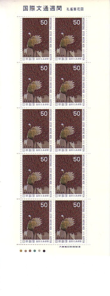 「国際文通週間1975 孔雀葵花図」の記念切手です(50円切手X10枚)。送料は普通便110円(郵送 複数落札でも同一料金)になります。