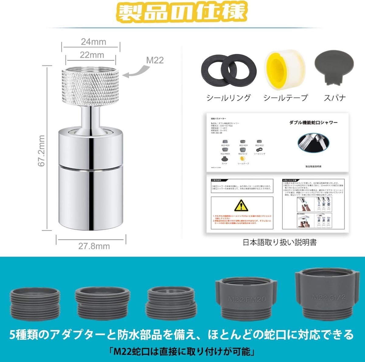 「取付けと取り外しが簡単」M22外ネジ蛇口は直接取り付けることができて、5種類のアダプータと防水部品を含まれます。ローレット滑り止め設計、ツールなしで簡単にフィルターを取り外してフィルター中の雑物を洗うことができます。