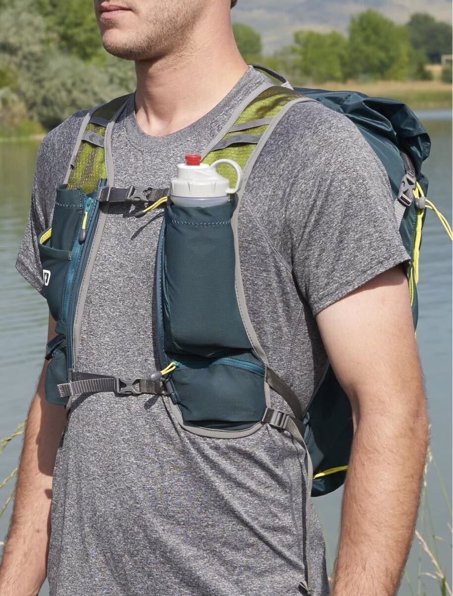 ベスト部分にもボトルポケット+ファスナーでマチを調整できるポケット
