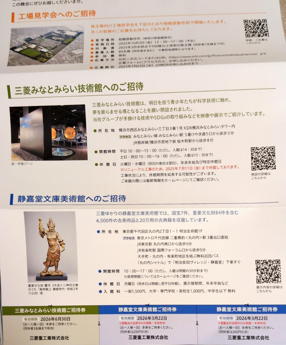 株主優待 三菱重工 三菱みなとみらい技術館 静嘉堂文庫美術館