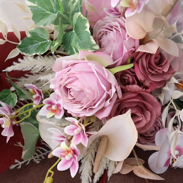 まるで本物のような繊細な美しさを放つ、ローズとオーキッド(胡蝶蘭)を贅沢にあしらった造花の花束です。