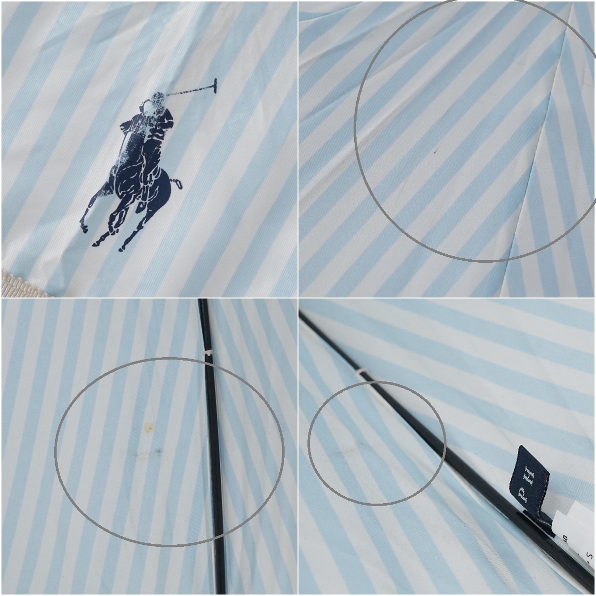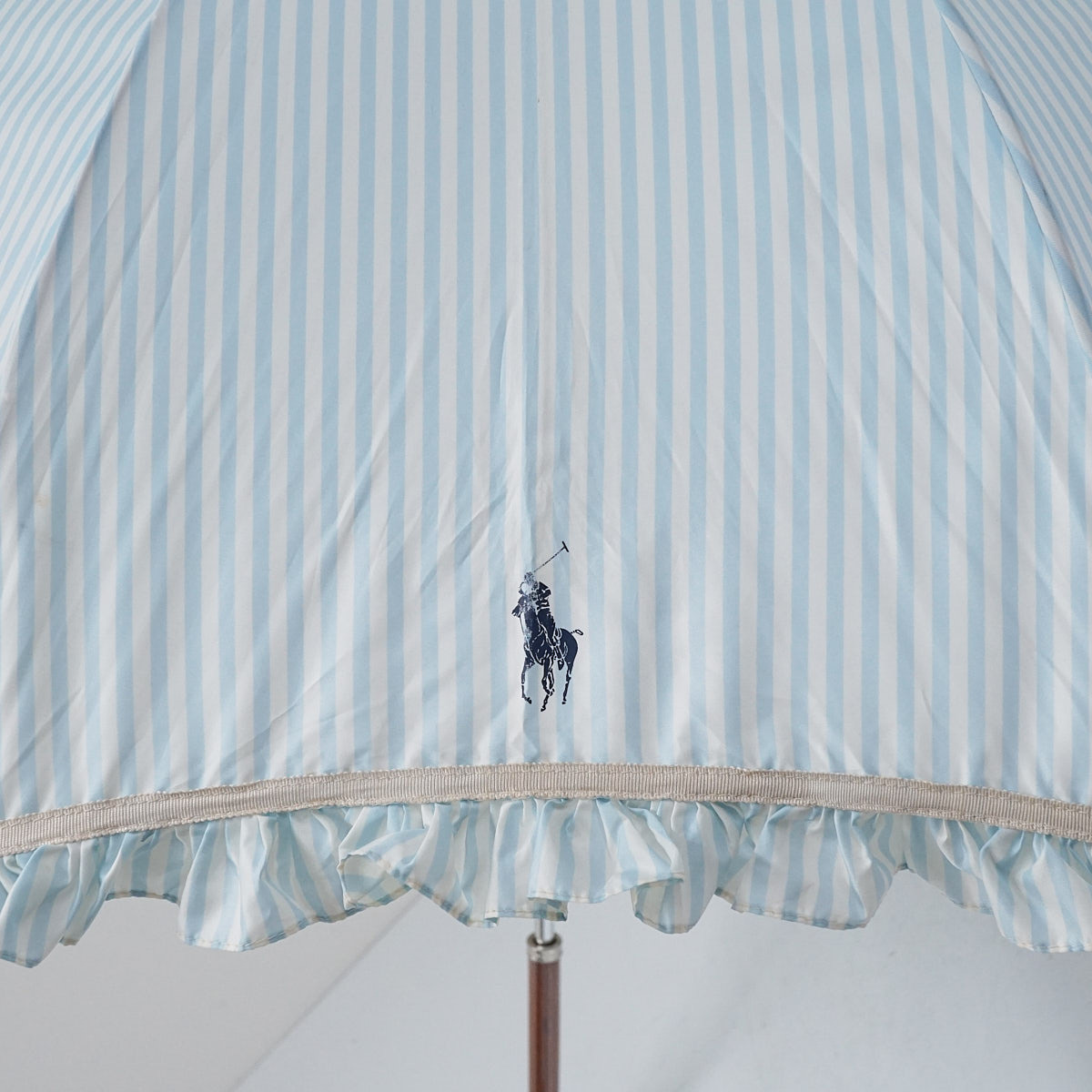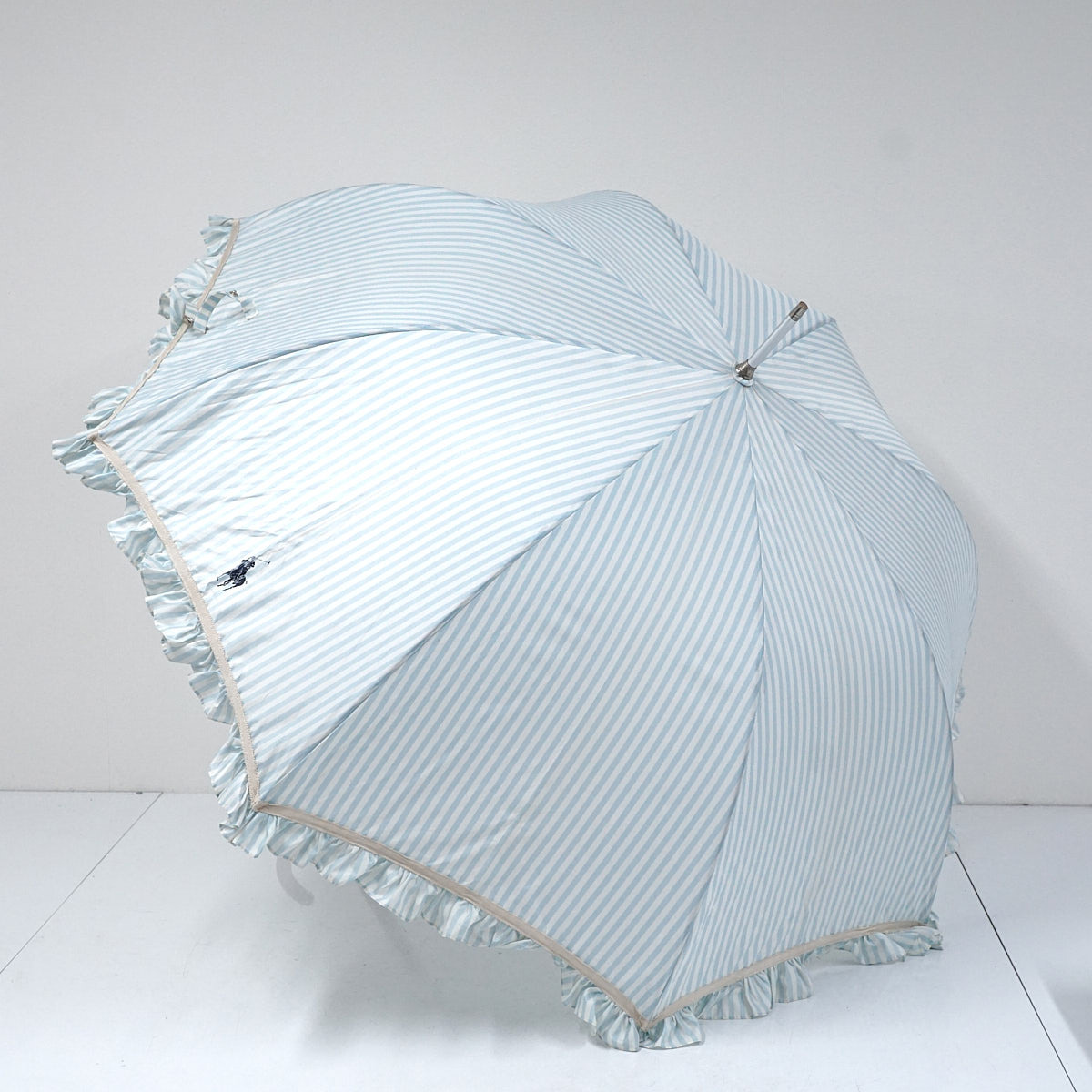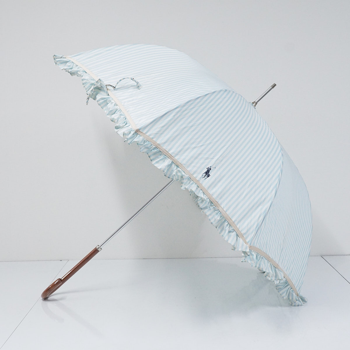 傘 POLO RALPH LAUREN ポロラルフローレン USED品 耐風傘 ストライプ フリル ポロポニート ジャンプ グラス骨 ライトブルー 60cm A3004