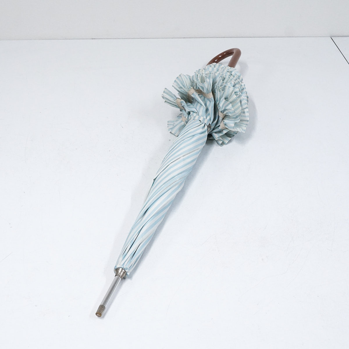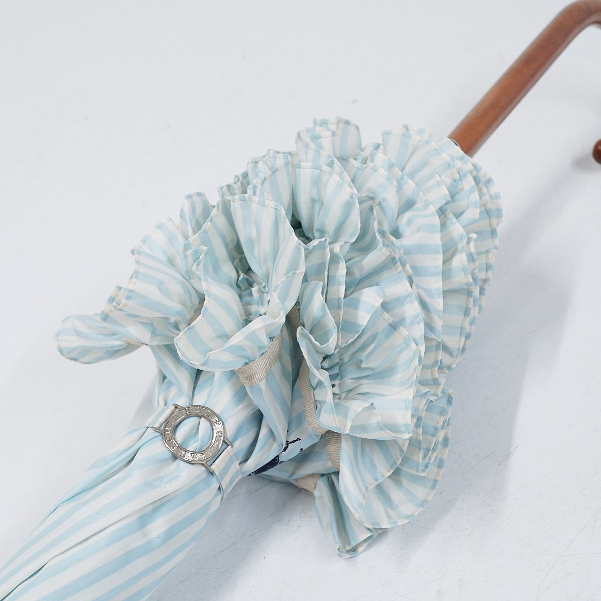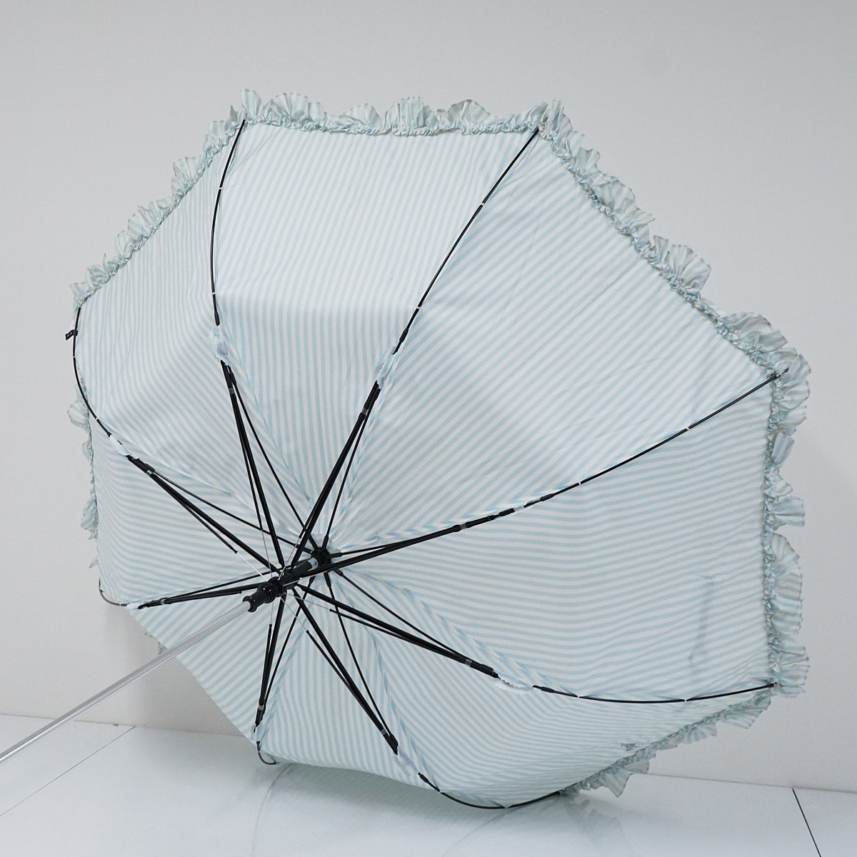 爽やかなストライプ柄とフリルの組み合わせが上品なかわいさのアンブレラです。