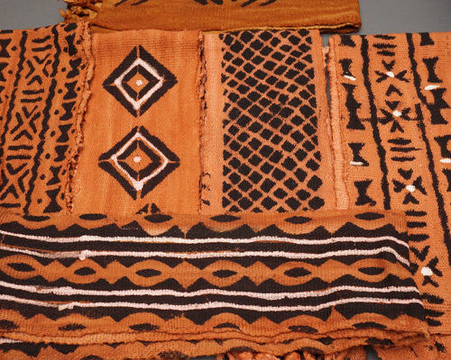 鉄分を含んだ発酵泥を使って模様が描かれ、太陽の力で染料が布に定着していきます。染めと乾燥を何度も繰り返すことで、黒や茶を基調とした深みのある色合いが生まれます。