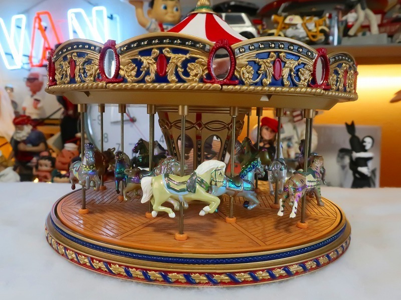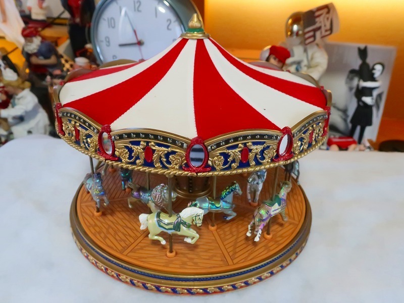 ミスタークリスマスのメリーゴーランドのオルゴールになります。クリスマスソング15曲、スタンダード曲15曲の30曲入っています。音楽、回転作動はしますがライトが点灯しません。修理できる方推薦です。ACダブターは付属しています。サイズは200×200×170です。