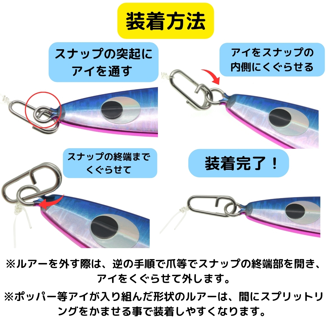 ※アイの入り組んだ形状のルアー(ポッパー等)はスプリットリングをかませる事で使用可能となります。