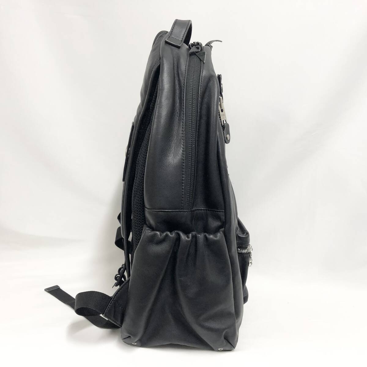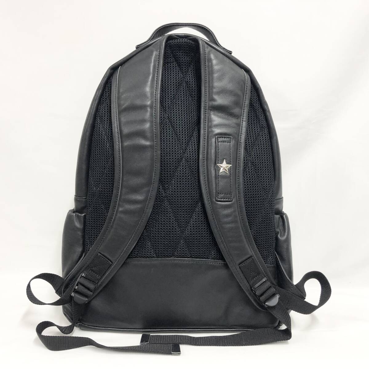 新型のRIDERS DAY PACK。メインの口は使いやすくする為、大きめにしてパソコン等が入ることを考え内側にクッション性のあるポケットを装備。こちらもダブルライダースのカラーをデザインに加え、下側に立体的な小物入れ、レザーバックでは珍しい、サイド(左右)にボトルホルダーを付けました。背にあたる部分は通気性のある素材にダイアモンドキルト、ショルダーにはワンスター付き、形状はアメリカ製のデイパックにあるようなラウンド型にしました。