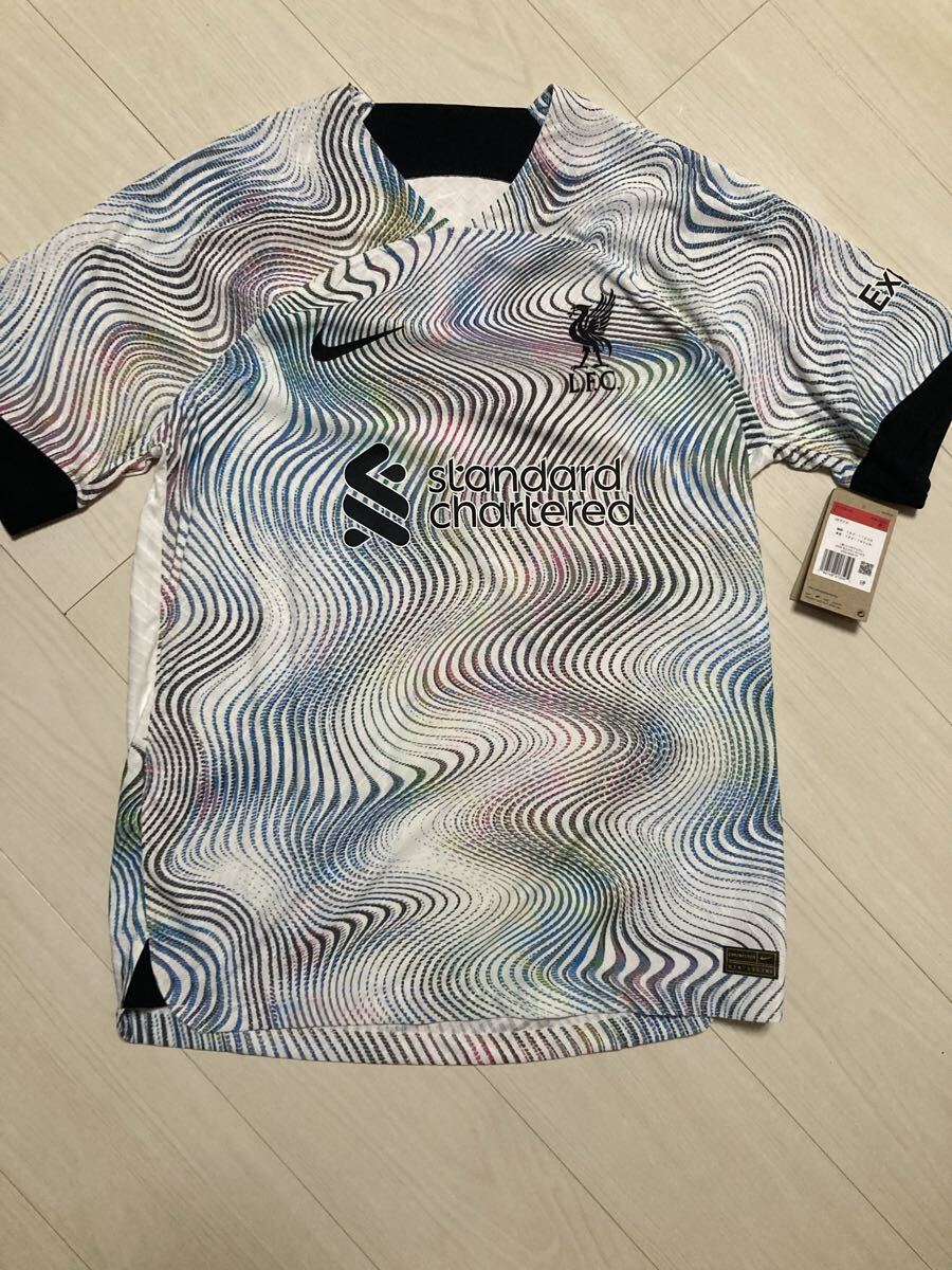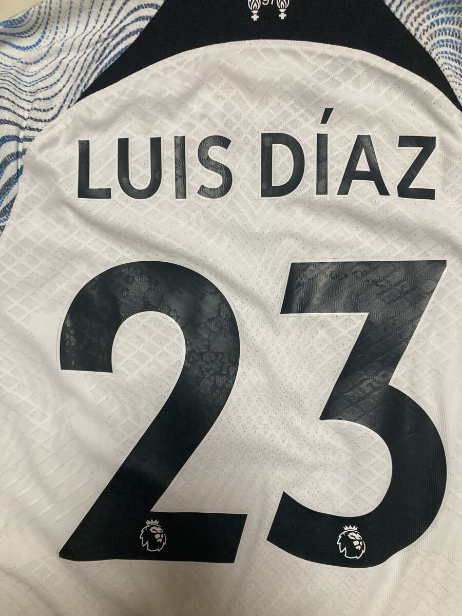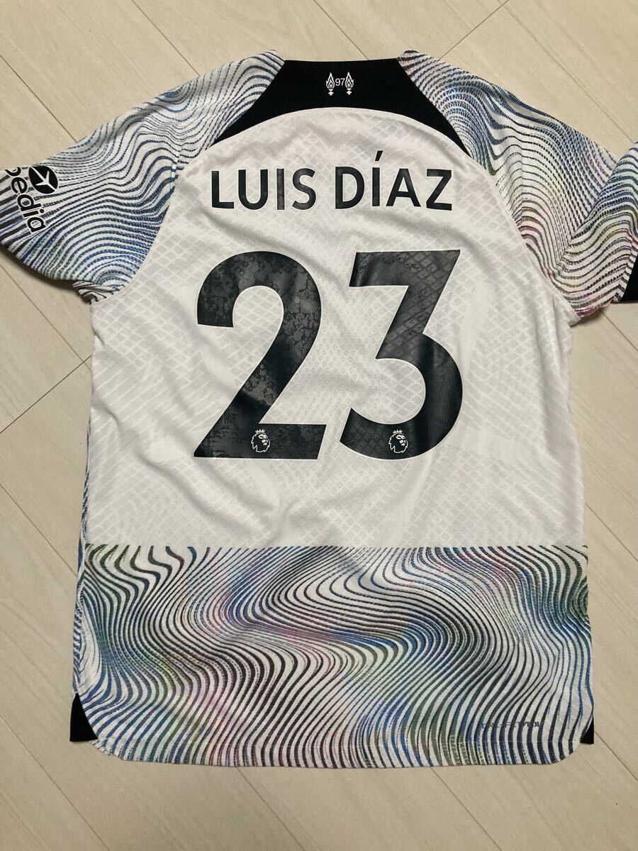 新品未使用タグ付きで、サイズはインポートLサイズです。NIKE ナイキジャパン社国内正規品です。Liverpool FCリバプール 2022-2023 アウェイユニフォームです。レプリカではなく、選手仕様オーセンティックDri-FIT ADVユニフォームです。コロンビア代表 背番号23番 Luis Diaz ルイスディアス選手のプレミアリーグオフィシャルマーキング付きです。今となっては新品未使用タグ付きでの入手が不可能なユニフォームです。