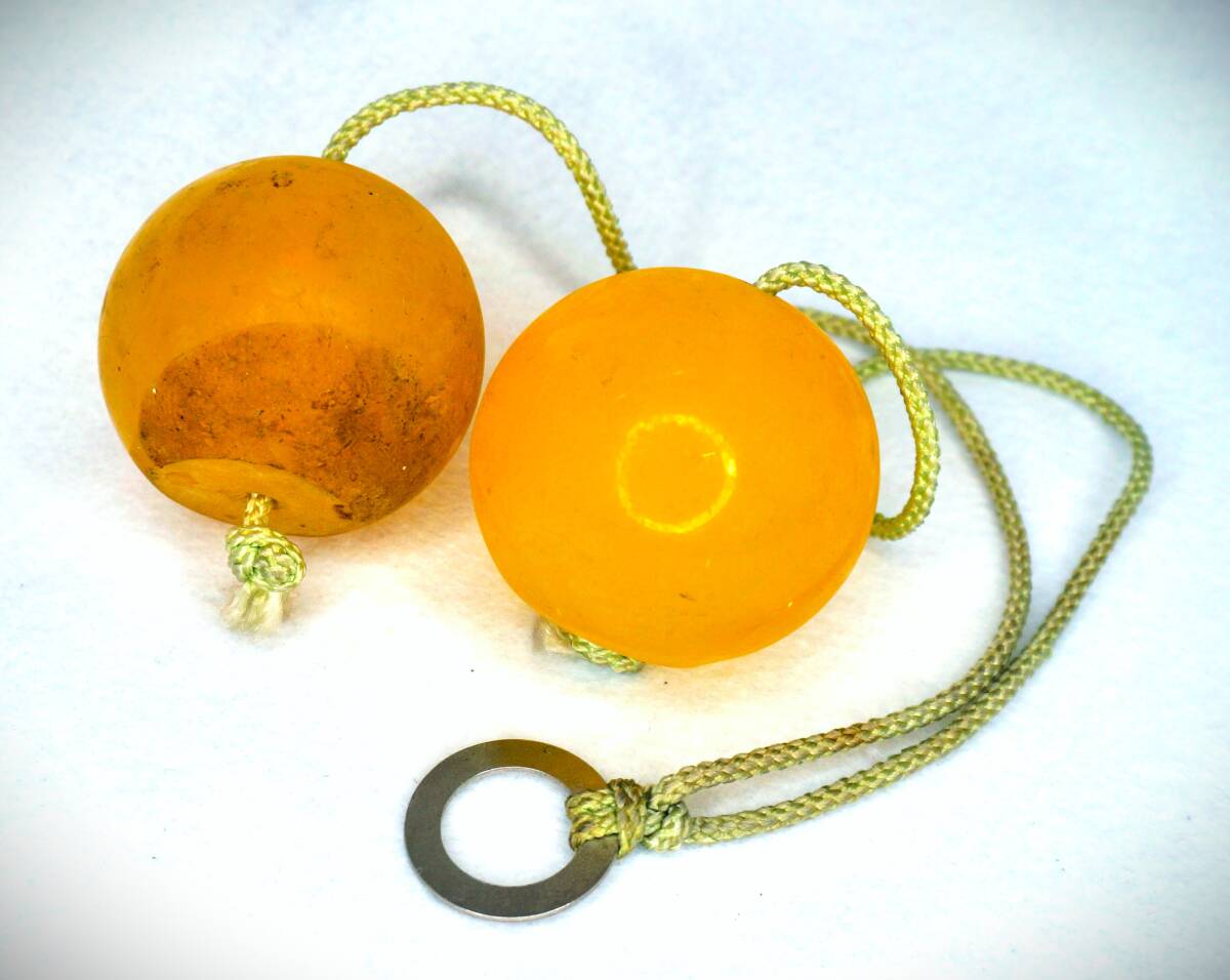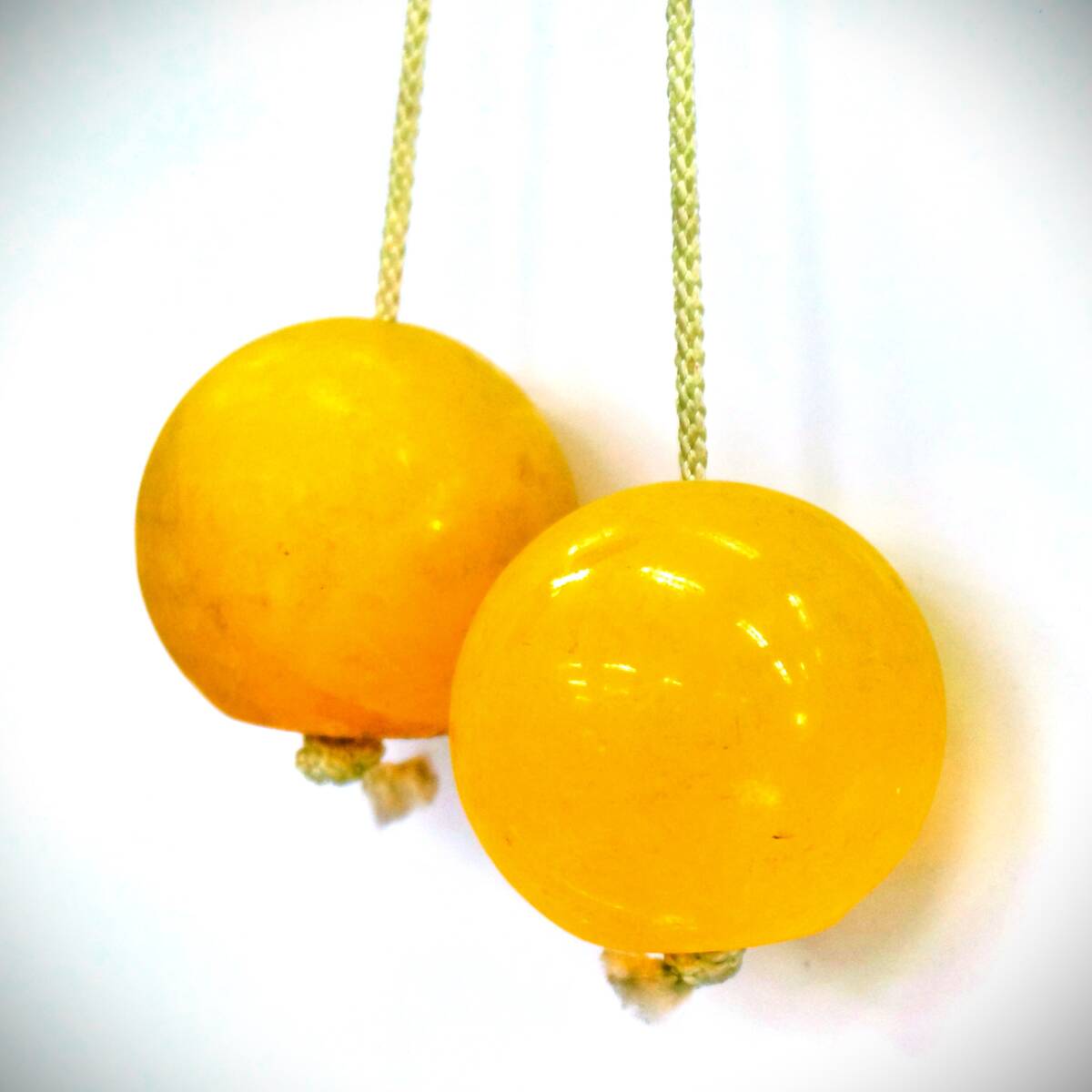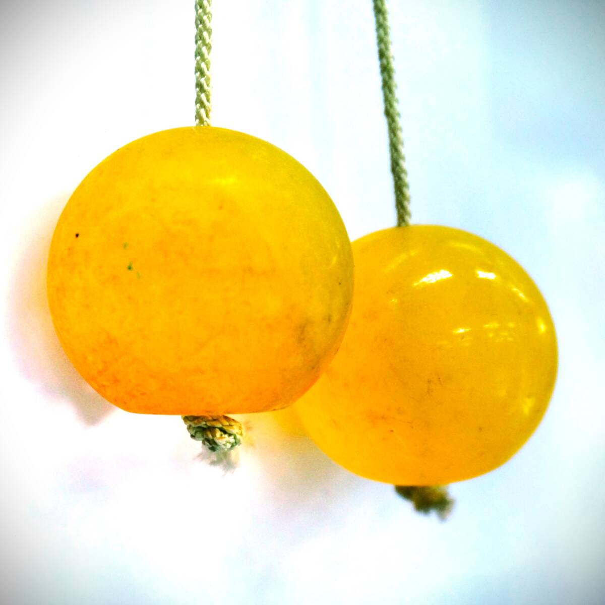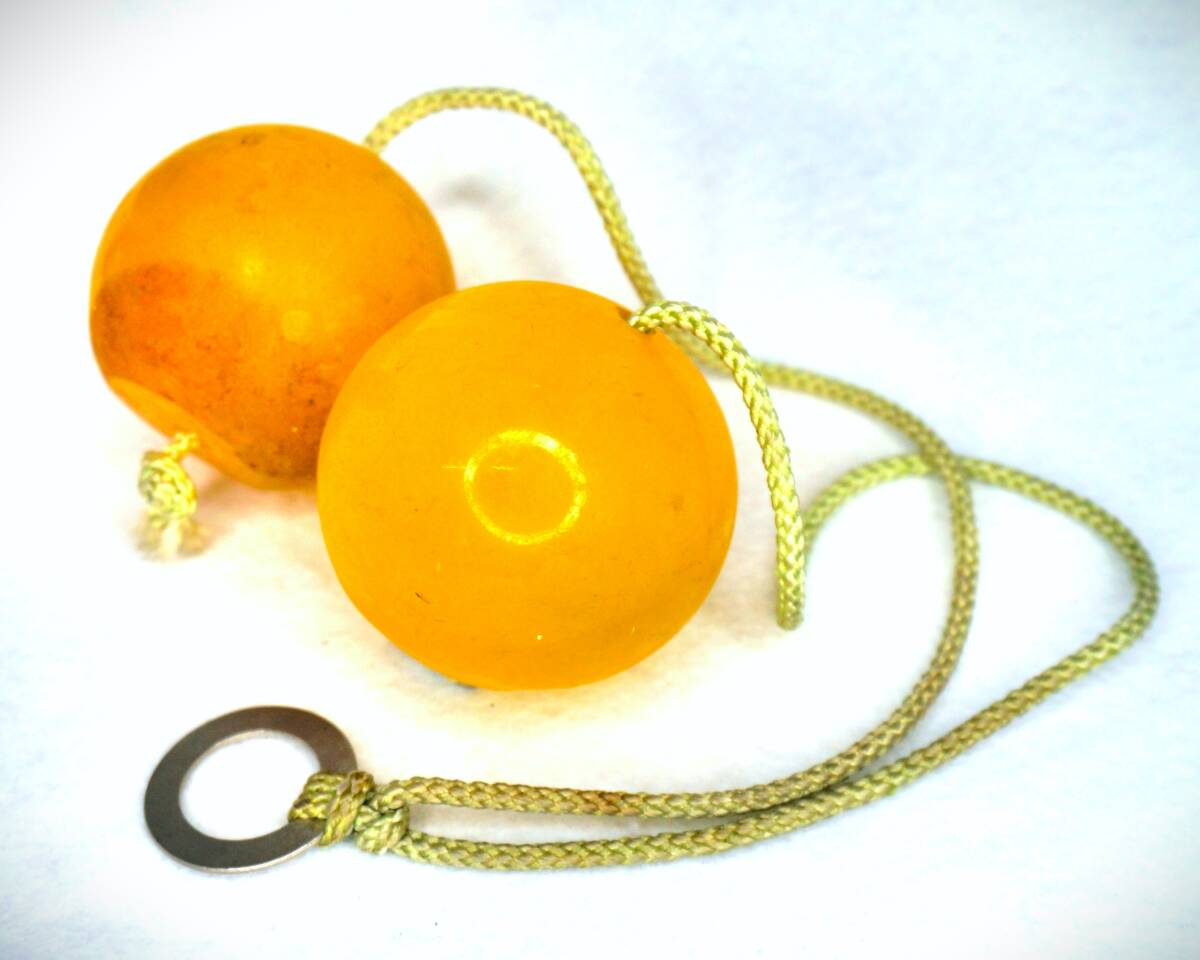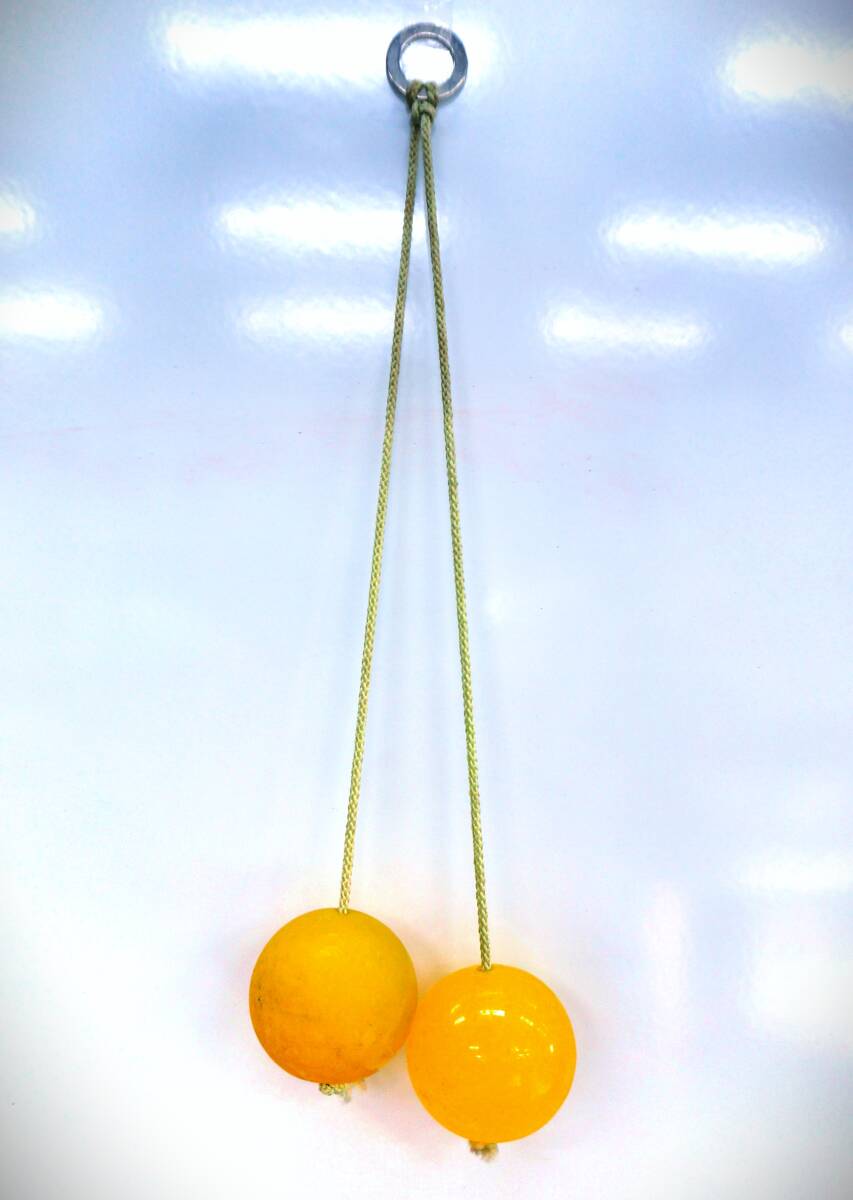 鮮やかな黄色(またはオレンジがかった黄色)の球体が二つ、丈夫な紐で繋がれたシンプルな作り。