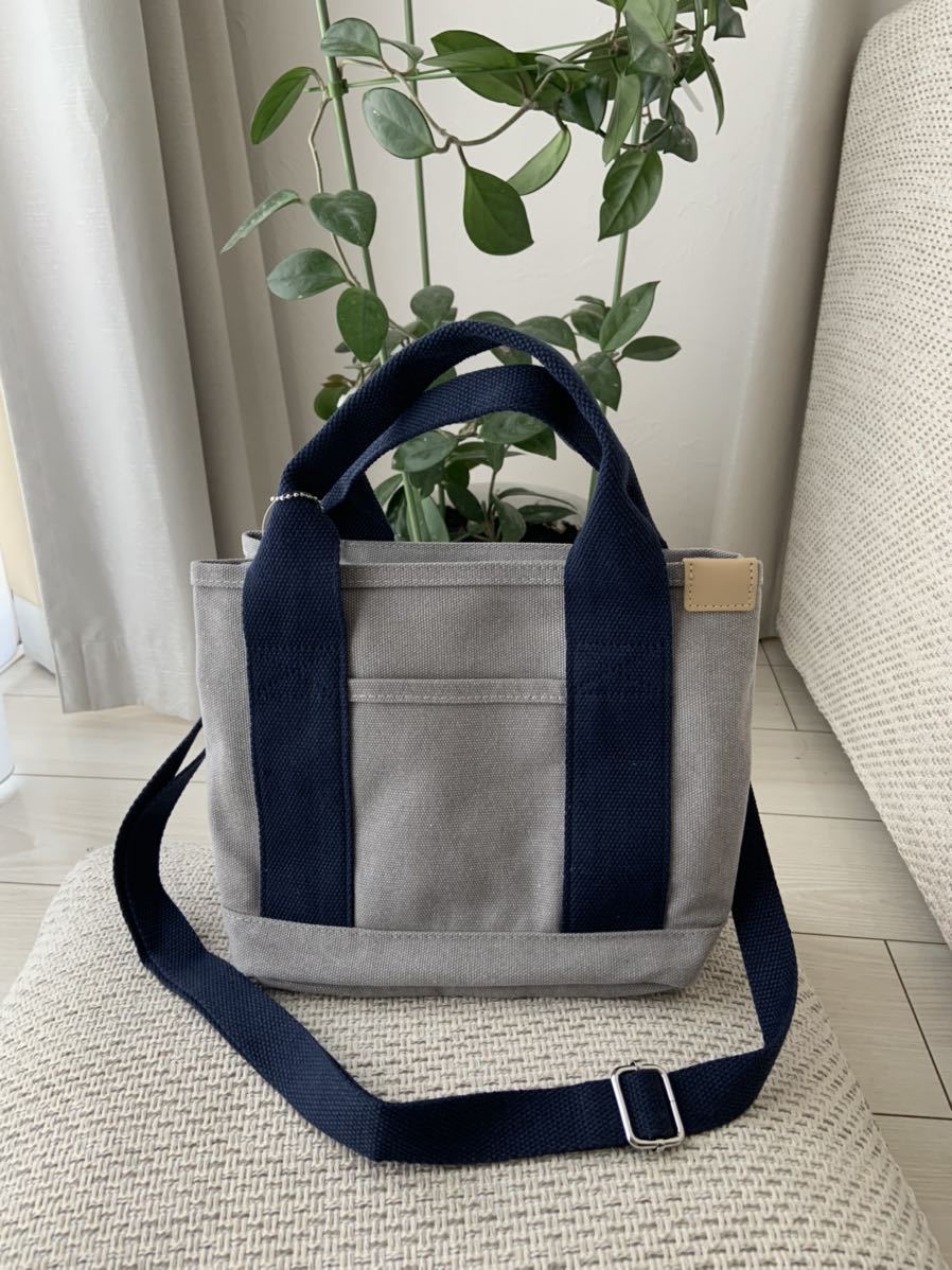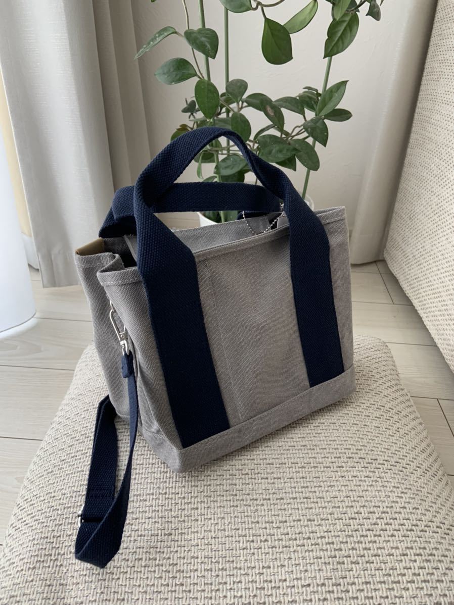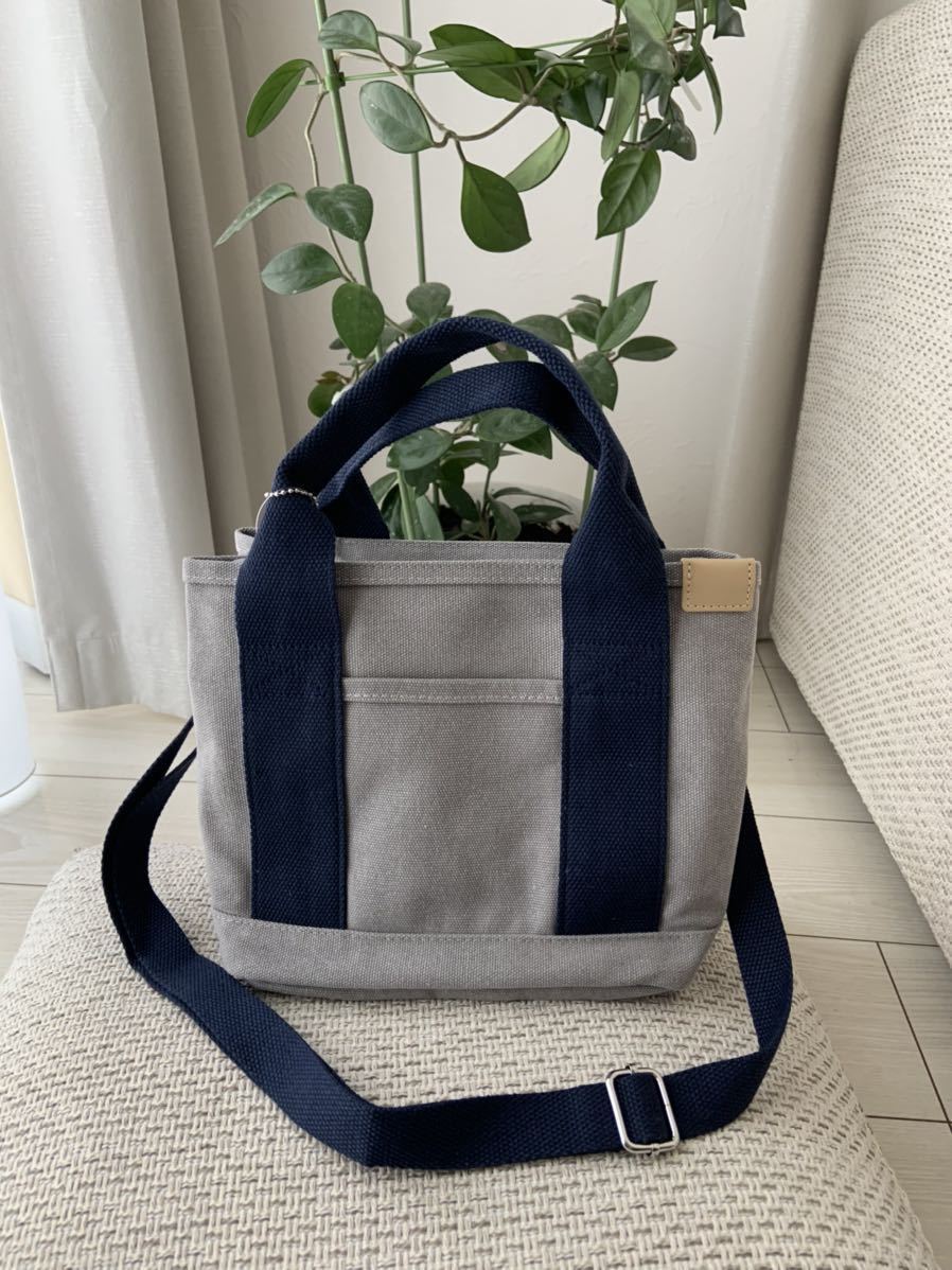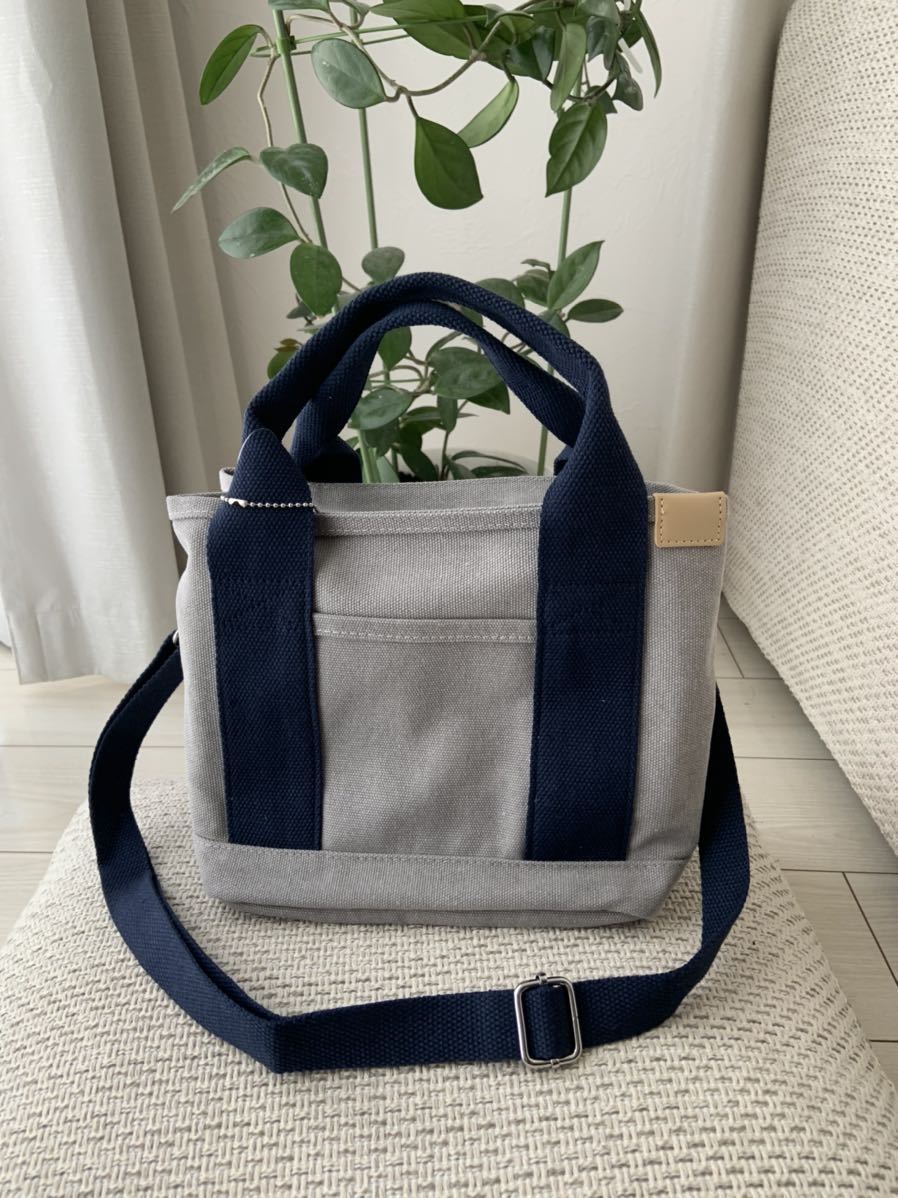 ミニトートバッグ 2way キャンバス 3仕切り ショルダートートバッグ 小さめ グレーxネイビー