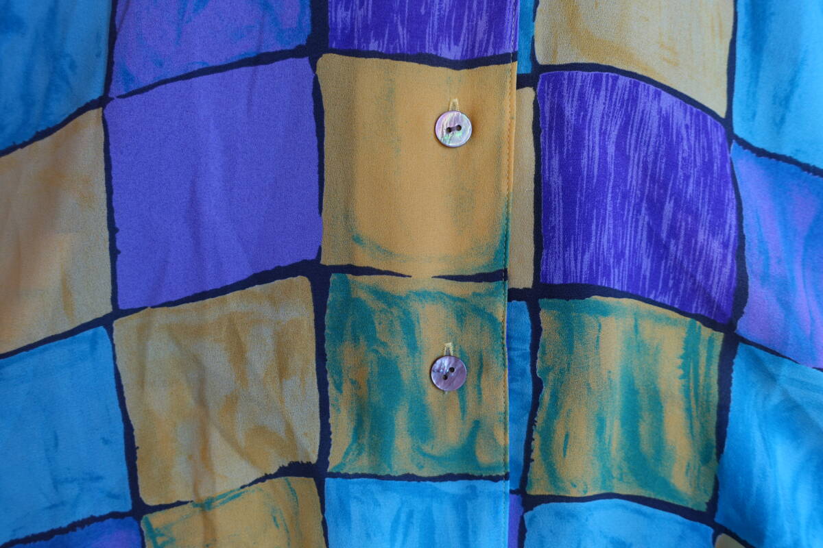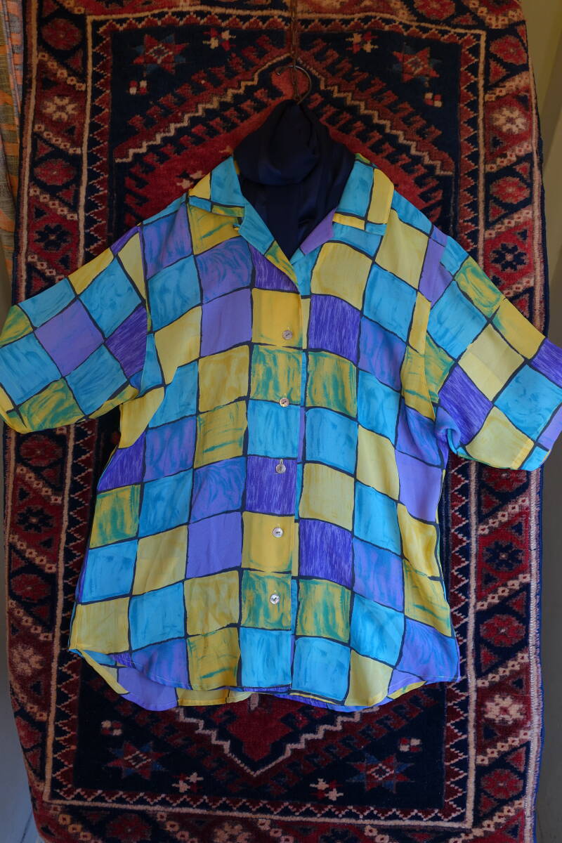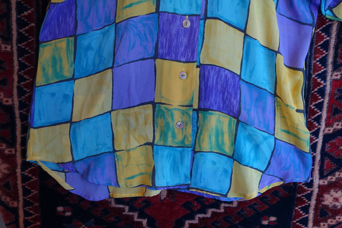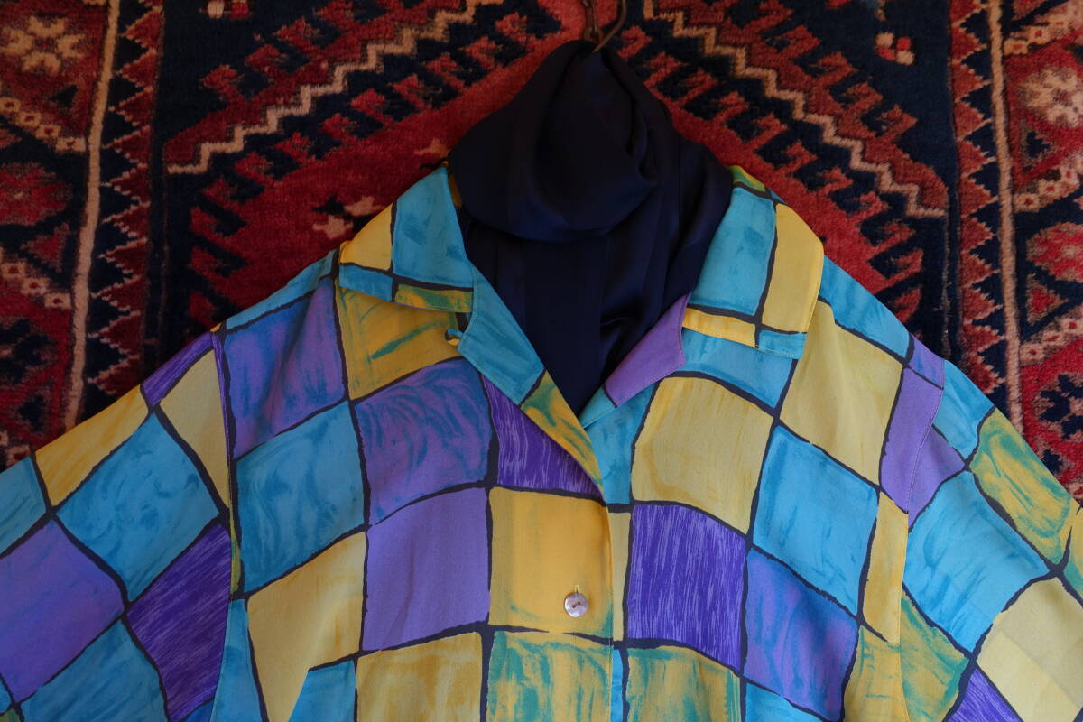 ○[70s80s90s vintage ヴィンテージ 青パープル黄 四角 市松 レトロシャツ]USED古着 昭和レトロ・モダン・モッズ