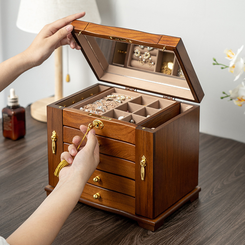 【キーワード】木製 ジュエリーボックス 高級感 宝石箱 収納 鏡付き 5段収納 大容量 指輪 保管 携帯 小物入れ ジュエリーケース