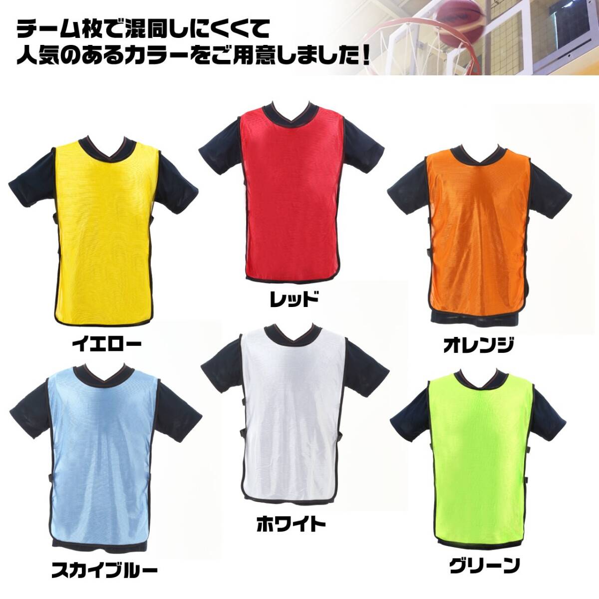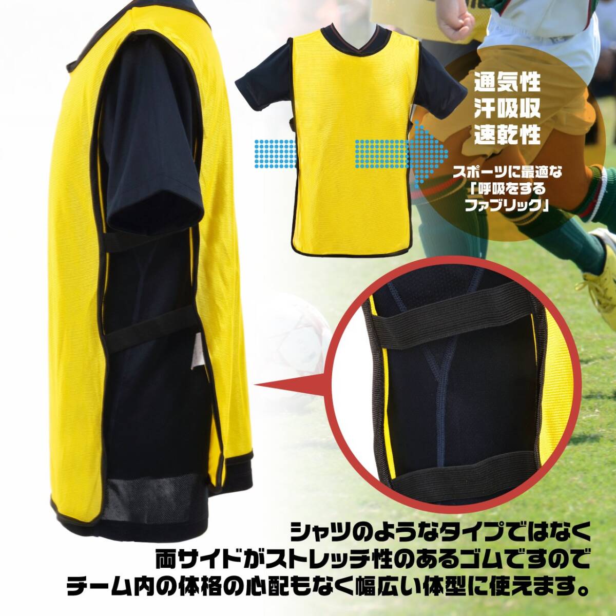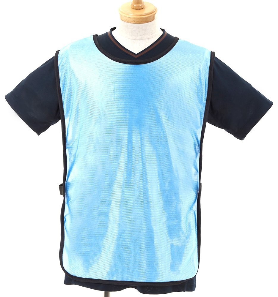 サイズ:フリーサイズ シャツのようなタイプではなく、両サイドがストレッチ性のあるゴムですので、チーム内の体格の心配もなく幅広い体型に使えます。お年を召した方は結構肩が上がらないのでTシャツタイプのビブスは脱ぎにくいといった不便な点がありますが、サイドゴムタイプはそういうこともありません。