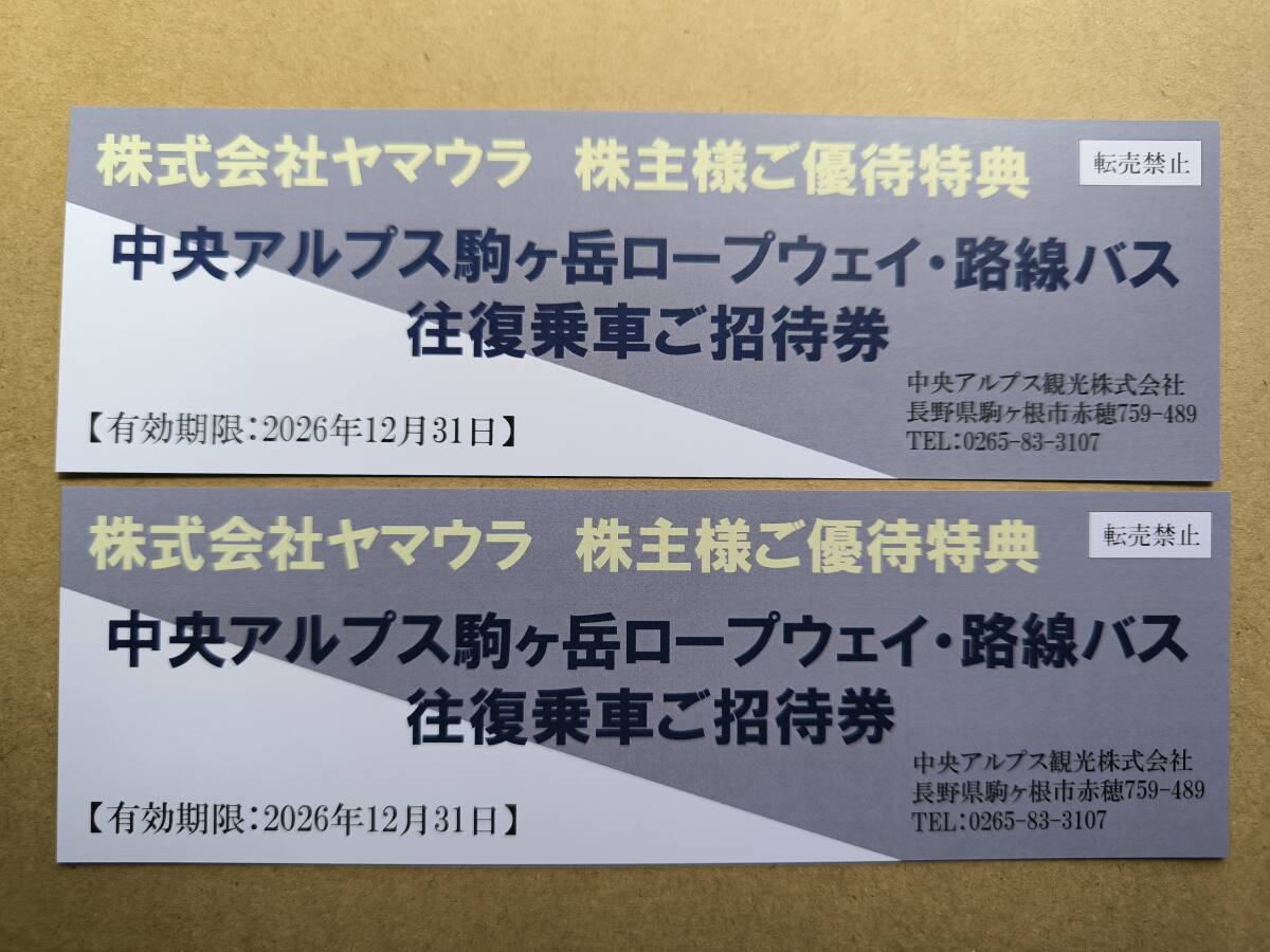 【送料無料・匿名配送(ゆうパケットポストmini)】ヤマウラ 株主優待 駒ケ岳ロープウェイ・路線バス 招待券 2枚 2026年12月31日まで