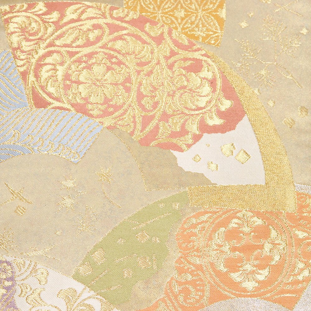 川島織物謹製 西陣織袋帯 金箔地 地紙文 唐花・華文・七宝文 (写真では上手く色が出ない場合があります。ご了承下さい) ※お使いのディスプレイの種類や設定の差により 実物の色と画像の色が少々異なることもございます。 |