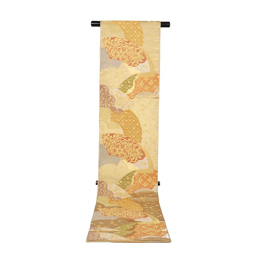 | 川島織物謹製 西陣織袋帯 金箔地 地紙文 唐花・華文・七宝文 川島織物 軍配マーク 仕立て上がり |